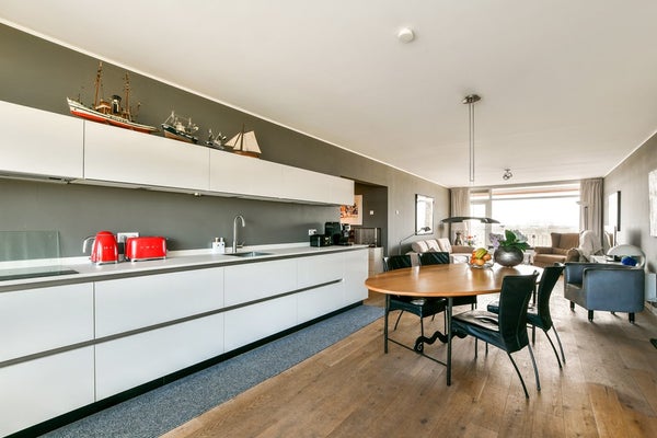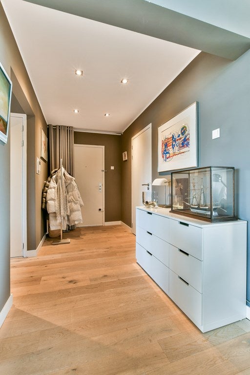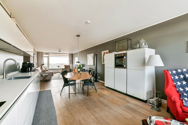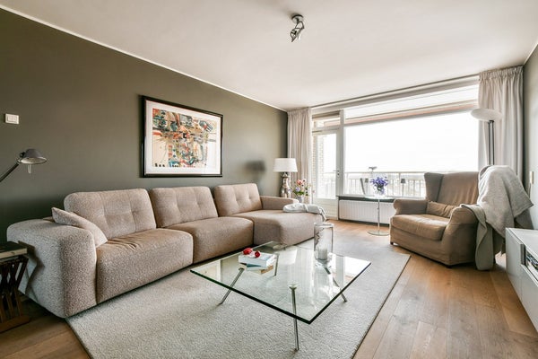 Via de centrale entree bereikt u met de lift of het trappenhuis de woning op de negende verdieping. Bij binnenkomst betreedt u de ruime hal, die toegang biedt tot de woonkamer, badkamer en een slaapkamer. De lichte en royale woonkamer beschikt over grote raampartijen en staat in directe verbinding met beide balkons, waar u volop kunt genieten van het uitzicht en de zon. De open keuken is compleet ingericht en voorzien van diverse inbouwapparatuur, zoals een inductiefornuis, afzuigkap, oven, vaatwasser, een koelkast en een vriezer.