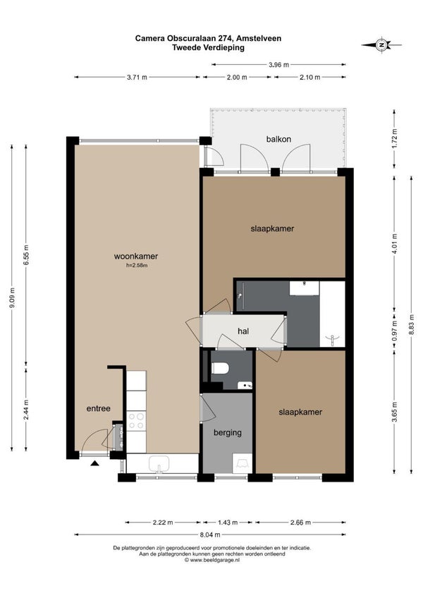 - De galerijflat heeft een woonoppervlakte van 73 m² en beschikt over 3 kamers, waarvan 2 slaapkamers;