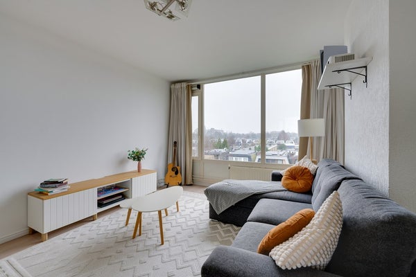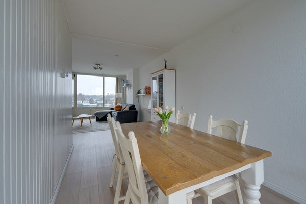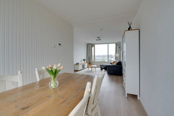 De ruime doorzonwoonkamer vormt het hart van de woning. Dankzij de grote raampartijen aan beide zijden geniet je hier de hele dag van prachtig daglicht en vrij uitzicht over het omliggende groen. De ligging op de bovenste verdieping zorgt bovendien voor extra privacy en rust.