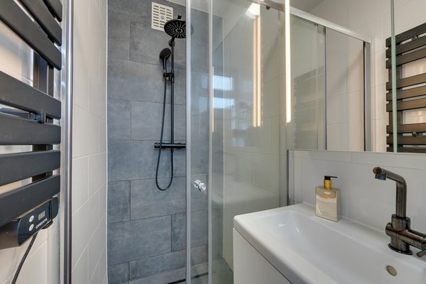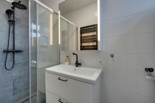 De badkamer is modern en fris afgewerkt en beschikt over een raam voor natuurlijke ventilatie. Al met al comfortabel én praktisch.