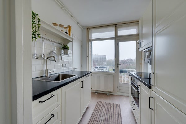 De moderne keuken (2023) is strak uitgevoerd en compleet uitgerust met onder andere een inductiekookplaat, vaatwasser, combi-oven, koel-/vriescombinatie en een luxe mengkraan. Hier kook je met plezier. Vanuit de keuken stap je direct het oostelijk gelegen balkon op. Dé plek voor een ontspannen start van de dag in de ochtendzon.