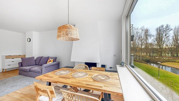 Je komt binnen in een heerlijk appartement. De woonkamer is ruim, heeft een open haard en kijkt vrij uit op groen en water. De gehele woning is strak gestuukt en de afwerking is zeer goed te noemen.