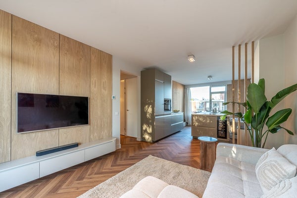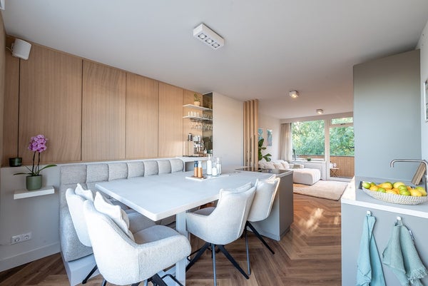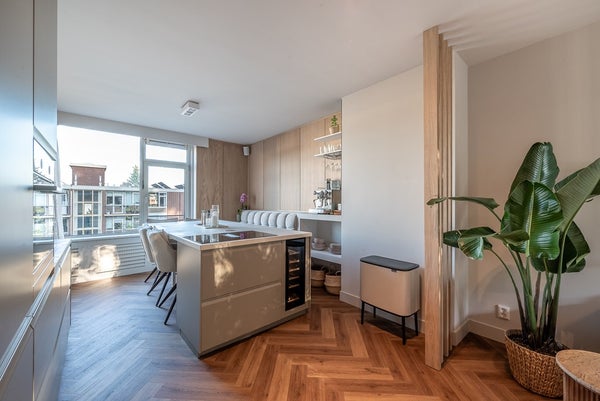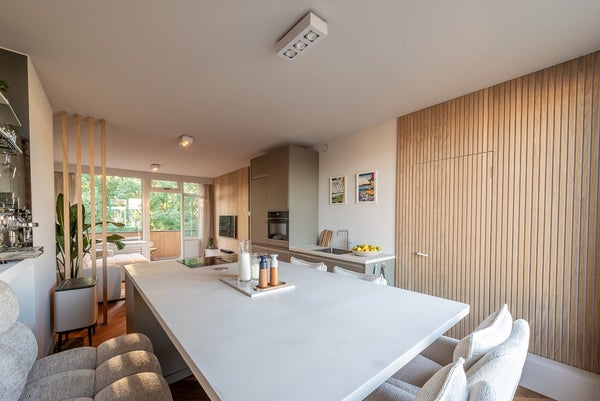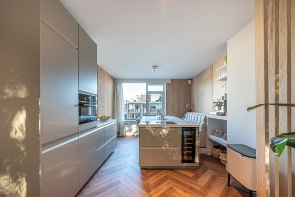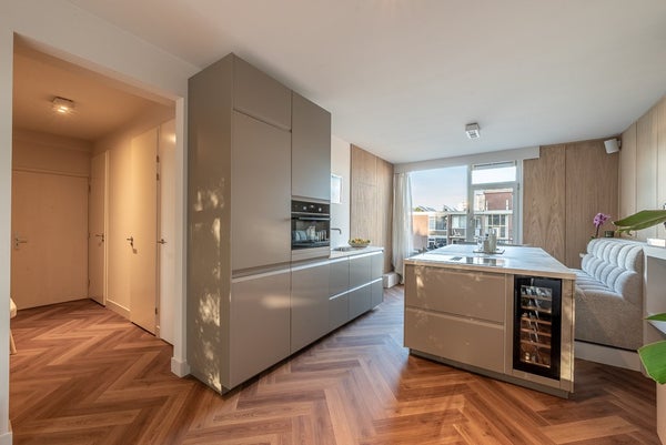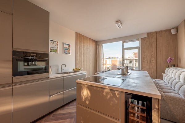 The living room extends from front to back and has a west-facing balcony. The open kitchen with cooking island is equipped with Quooker tap and AEG built-in oven/microwave, dishwasher, refrigerator, wine fridge, and induction hob with integrated extraction.