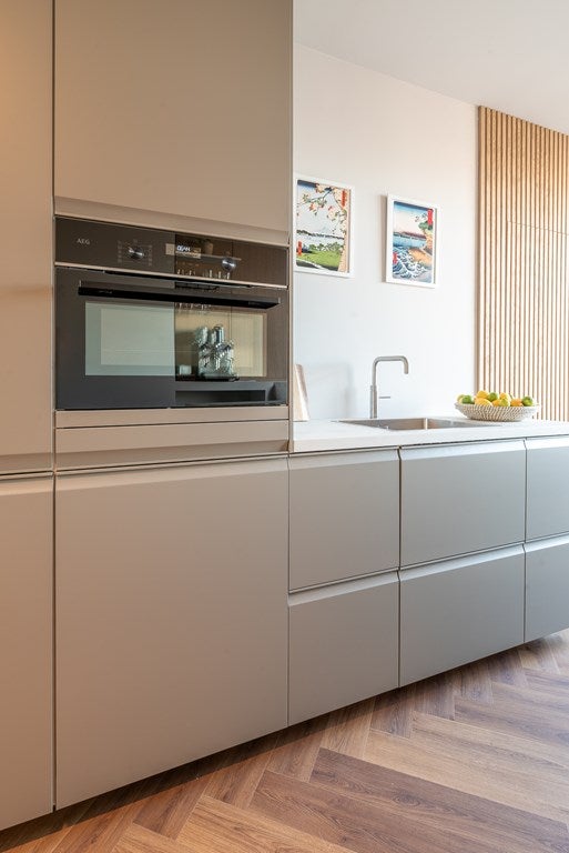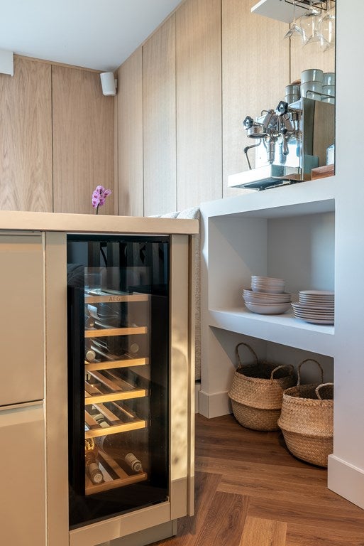 De open keuken met kookeiland is uitgerust met een Quooker kraan en AEG inbouw oven/magnetron, vaatwasser, koelkast, wijnklimaatkast en een inductieplaat met ingebouwde afzuiging.