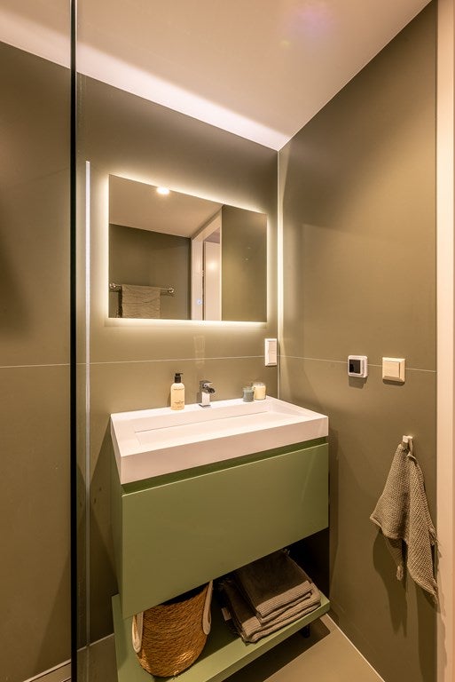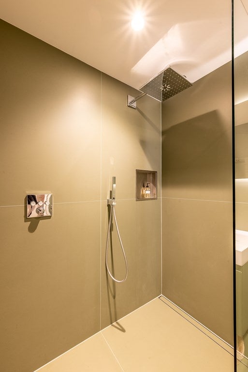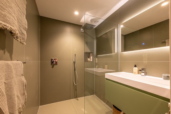 De moderne badkamer is voorzien van grote wand- en vloertegels in dezelfde kleurtoon voor een minimalistisch en rustgevend effect.