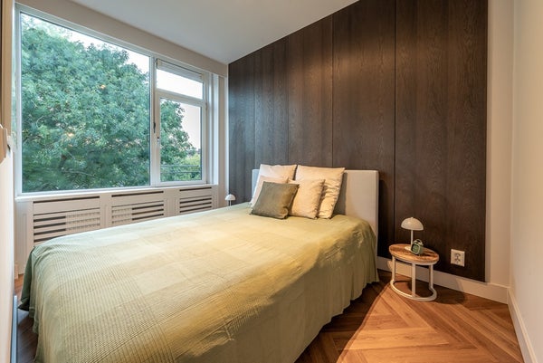 The main bedroom is divided by a partition wall separating the sleeping and wardrobe area. The sleeping area features oakwood wall panels at the head of the bed. The wardrobe area is fitted with a build-in closet stretching the full width of the room. This bedroom faces west with views of the inner garden and enjoys great privacy due to the greenery.