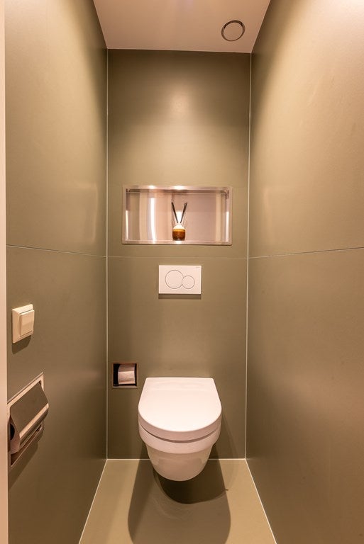 Het separate toilet in de hal heeft vloerverwarming, een ingebouwde toiletrolhouder, koker en een nis. Naast het toilet is er een aparte kast voor de wasmachine en droger.