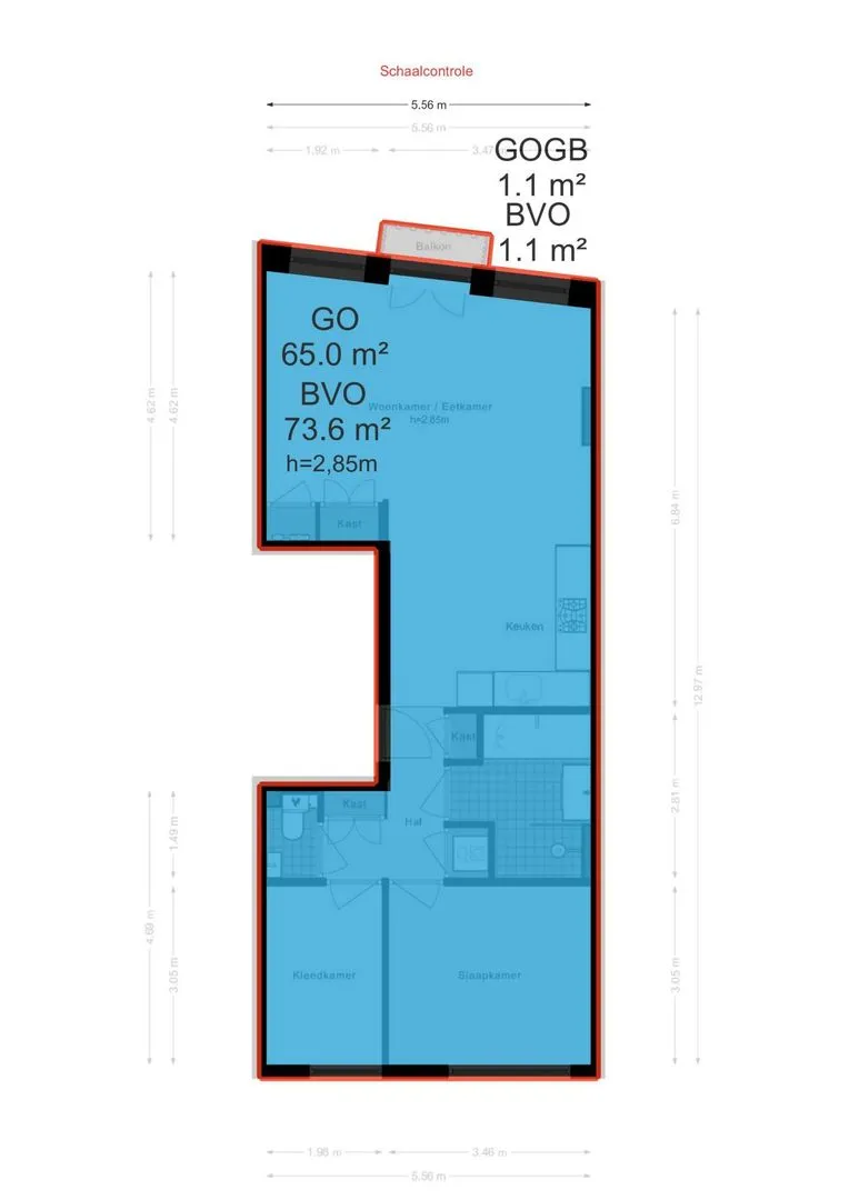 - De galerijflat heeft een woonoppervlakte van 65 m² en beschikt over 3 kamers, waarvan 2 slaapkamers;