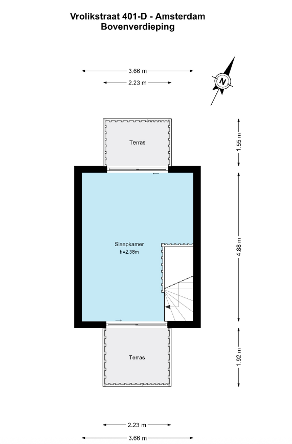 - De bovenwoning heeft een woonoppervlakte van 75 m² en beschikt over 3 kamers, waarvan 2 slaapkamers;