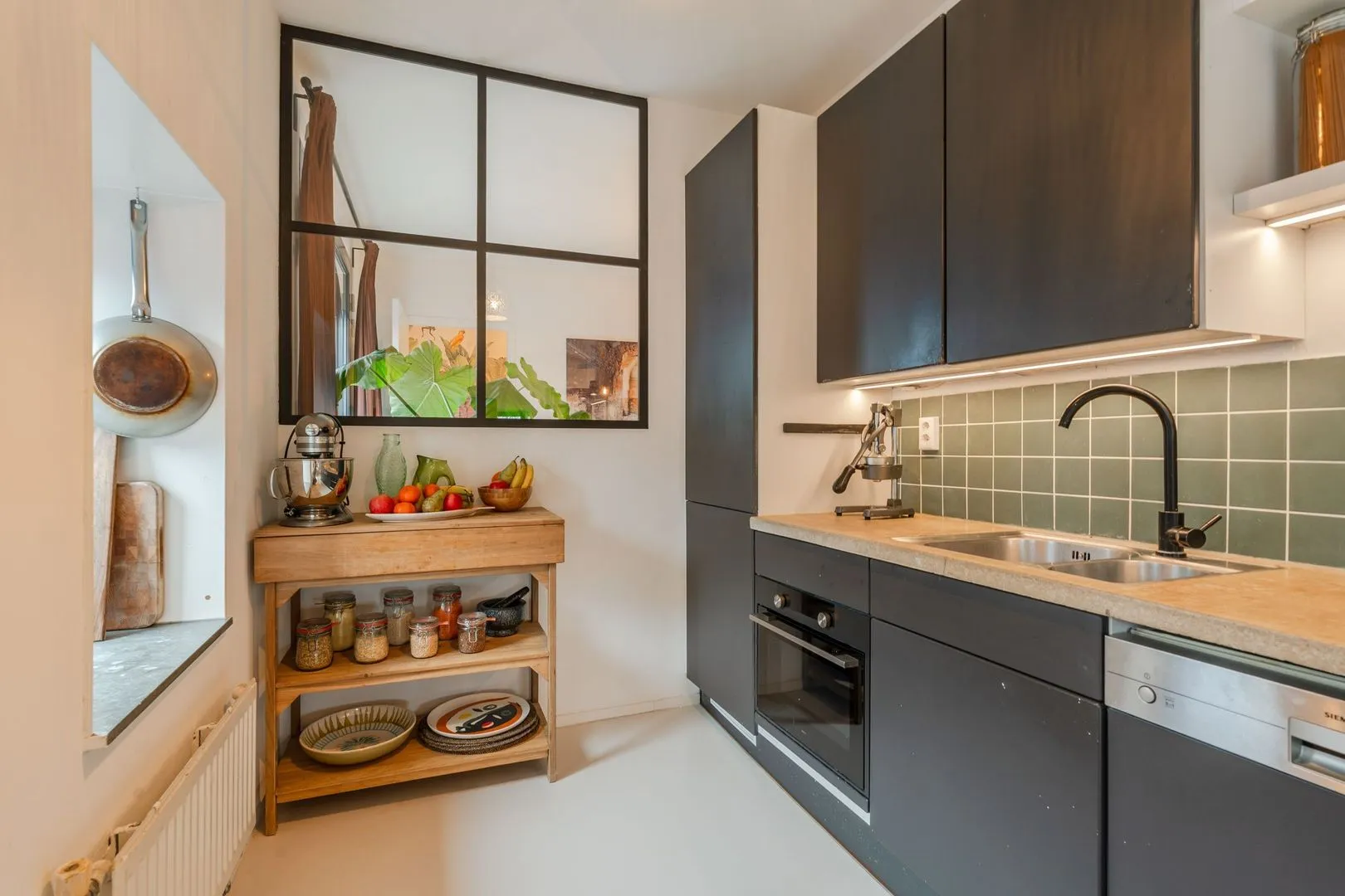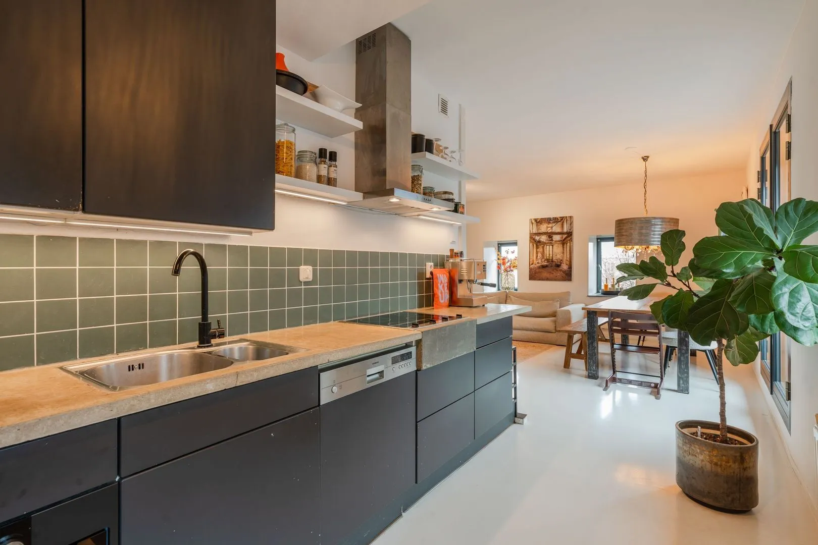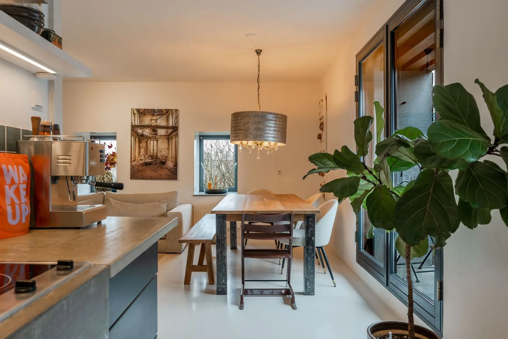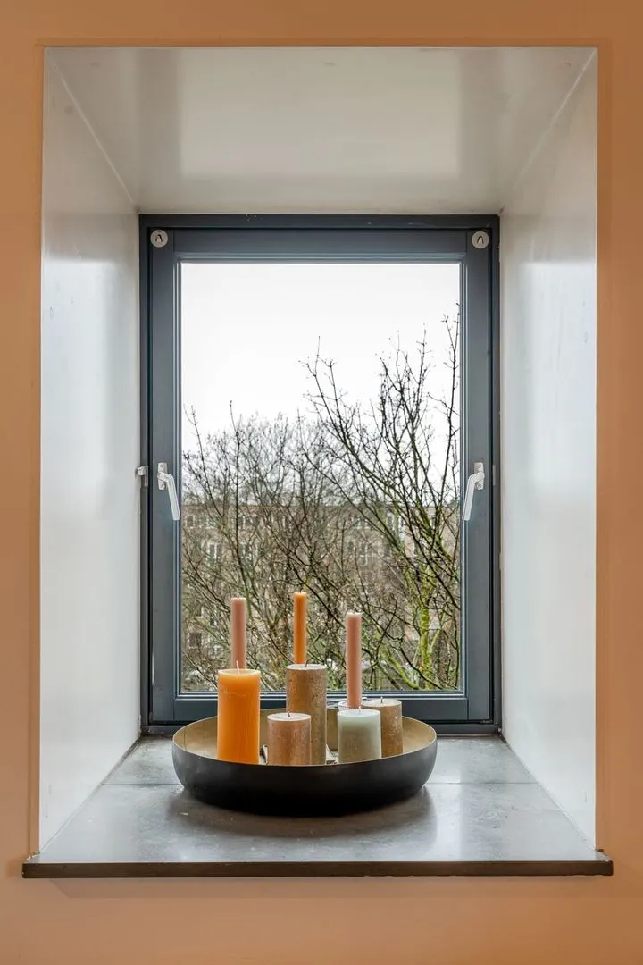 Dit lichte 3-kamer hoekappartement in het iconische Pakhuis Oostenburg biedt een unieke combinatie van historisch karakter en modern comfort. Gelegen op de derde verdieping, prijken grote raampartijen en twee loggia’s die zorgen voor een overvloed aan natuurlijk licht. De ruime woonkamer met openslaande deuren leidt naar de eerste loggia, terwijl de halfopen keuken is voorzien van moderne inbouwapparatuur en een betonnen aanrechtblad.