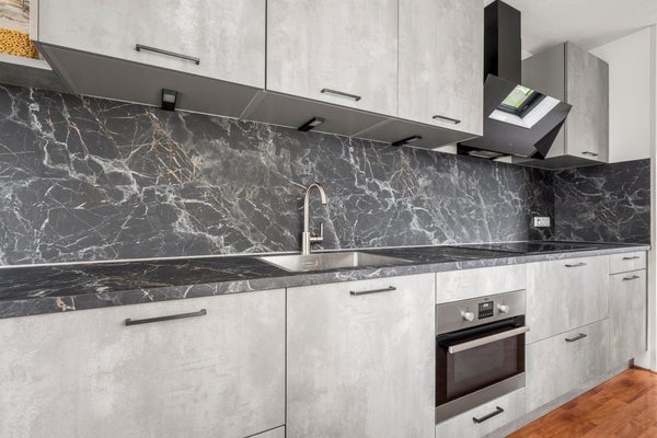 De moderne keuken (bouwjaar 2023) is uitgevoerd in stijlvol grijs met marmerlook werkblad en beschikt over diverse inbouwapparatuur, waaronder een 4-pits inductiekookplaat met afzuigkap, oven en vaatwasser. Aansluitend ligt de eetkamer, ruim genoeg voor een grote eettafel.
