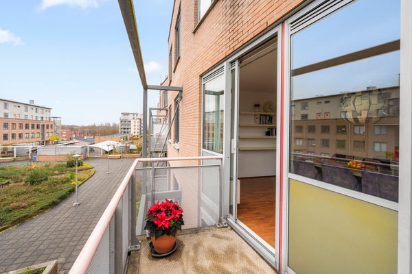 Via trap of lift bereikt u dit fijne hoekappartement op de 3e verdieping. De ruime hal biedt toegang tot alle vertrekken. Aan de voorzijde bevindt zich de lichte living met grote ramen en toegang tot het eerste balkon, met uitzicht op een groene speeltuin.
