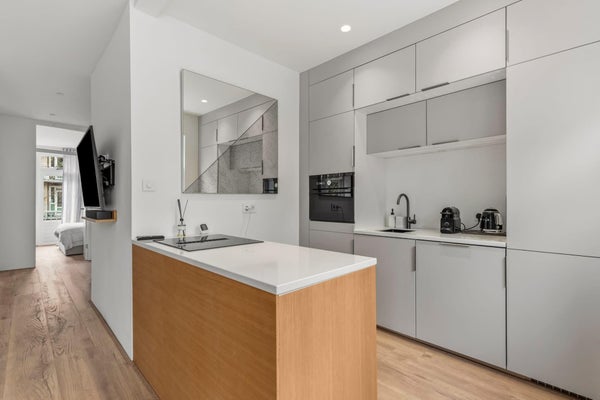 De lichte woonkamer met aangrenzende werkkamer/logeerkamer biedt een ideale balans tussen wonen en werken. De open keuken, uitgevoerd in natuurlijke materialen en uitgerust met topklasse inbouwapparatuur van Gaggenau, vormt het hart van de woning – perfect voor wie houdt van koken en gezellig samenzijn.