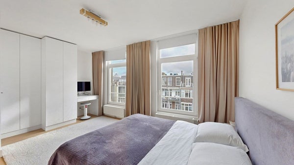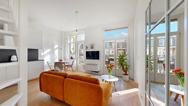 Via het brede en nette trappenhuis met daglicht bereik je de woning. Eenmaal binnen valt meteen de hoeveelheid licht op. Grote ramen, hoge plafonds en een strakke afwerking. De lamelparket houten vloer en strak gestuukte wanden geven het appartement een rustige en luxe uitstraling.
