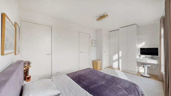 De woonkamer voelt ruim en open. Dankzij de grote raampartijen, een enkele deur en dubbele deuren naar het balkon loopt binnen moeiteloos over in buiten. Het balkon op het zuiden is royaal en een fijne plek om de dag te beginnen of af te sluiten.