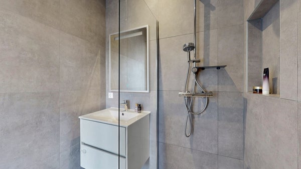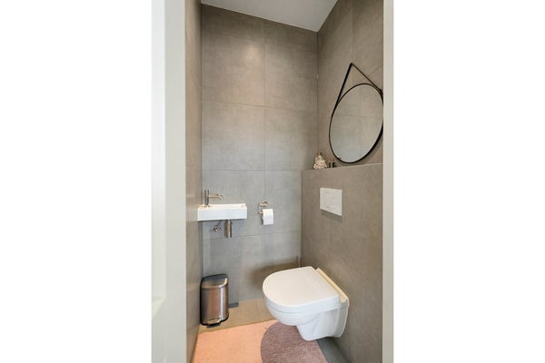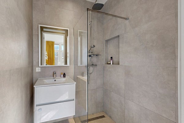 Op de woonverdieping ligt de eerste ruime slaapkamer. Licht, rustig en groot genoeg voor een extra werkplek. Aansluitend vind je de eerste badkamer, luxe afgewerkt met antraciet tegels en een comfortabele inloopdouche. Het toilet is separaat.