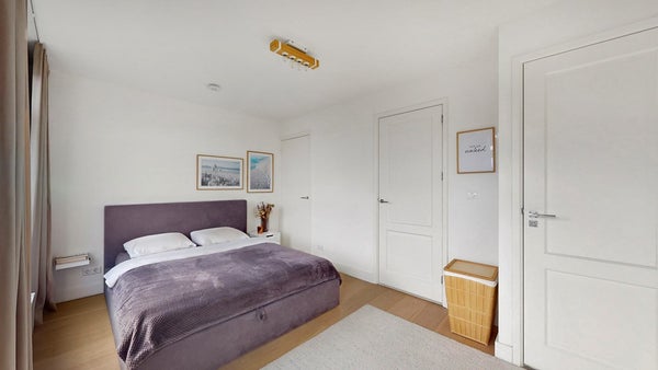 De bovenste verdieping verrast opnieuw met veel licht. Hier bevindt zich de tweede slaapkamer met vaste kastenwand en een tweede thuiswerkplek. Ook deze verdieping heeft een eigen luxe badkamer met inloopdouche.
