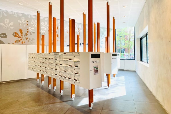 Via de moderne gezamenlijke entree met bellentableau, brievenbussen, lift en trappenhuis