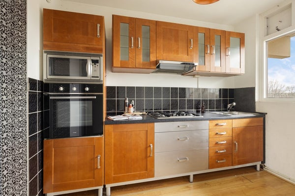 Via het gemeenschappelijke trappenhuis of de lift bereikt u dit appartement op de vierde etage. U komt binnen in de hal, welke toegang geeft tot de diverse vertrekken. De keuken is praktisch ingericht en voorzien van diverse inbouwapparatuur, waaronder een 5-pits gasfornuis, oven en magnetron. Aansluitend bevindt zich een handige berging/bijkeuken, ideaal voor extra opslag.