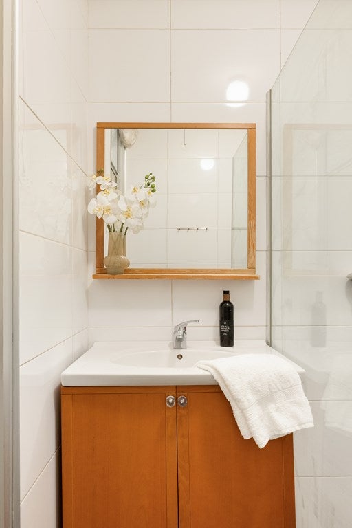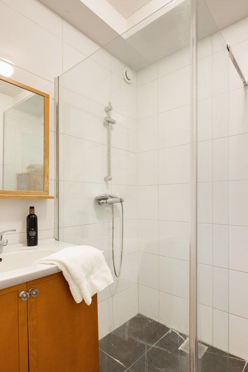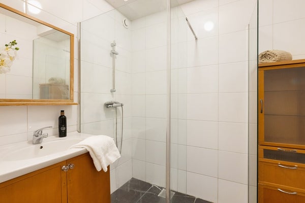 De eerste slaapkamer is gelegen aan de voorzijde van het appartement, de tweede slaapkamer bevindt zich aan de achterzijde. De badkamer is centraal gelegen en voorzien van een douche, wastafel en de aansluitingen voor wasmachine.