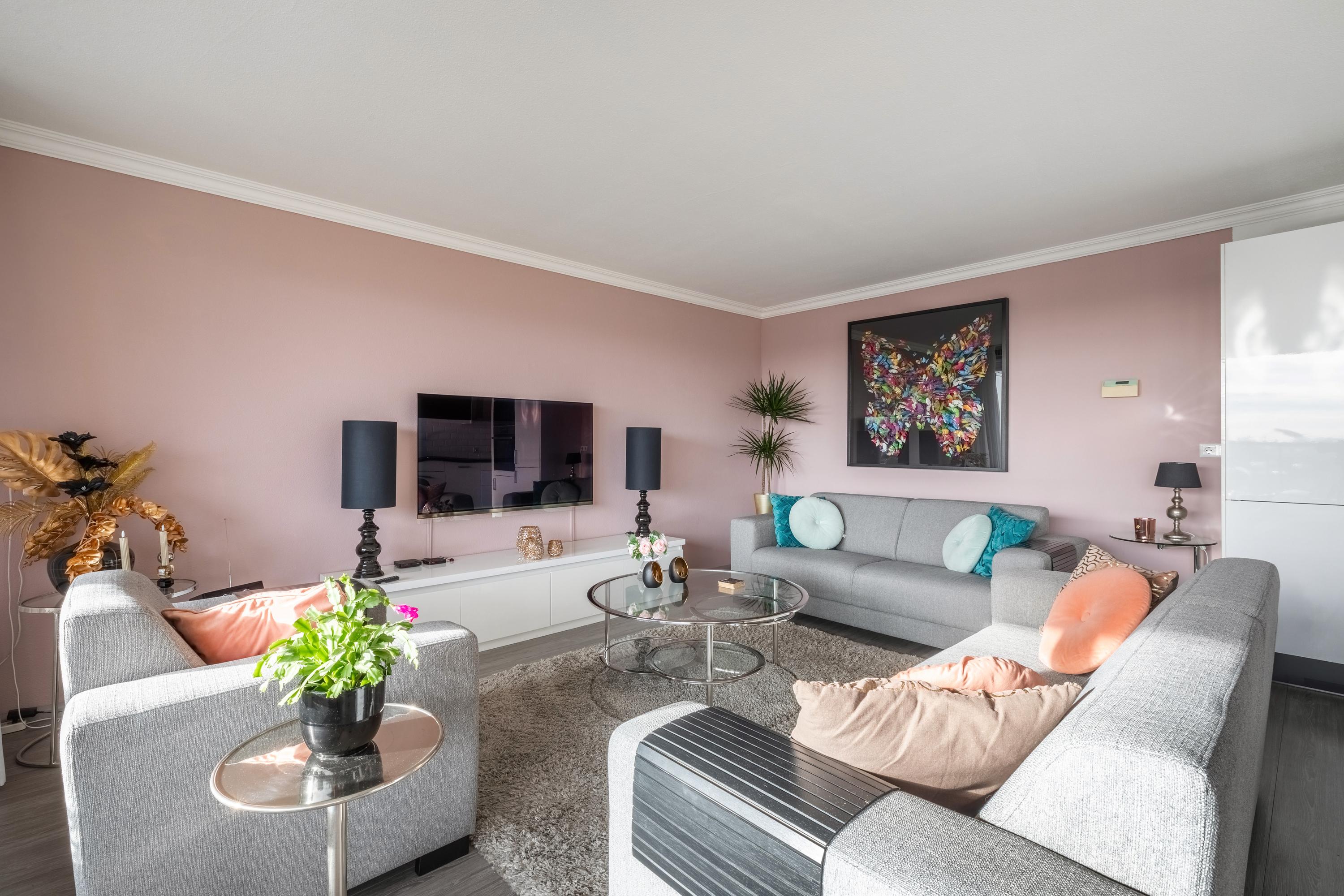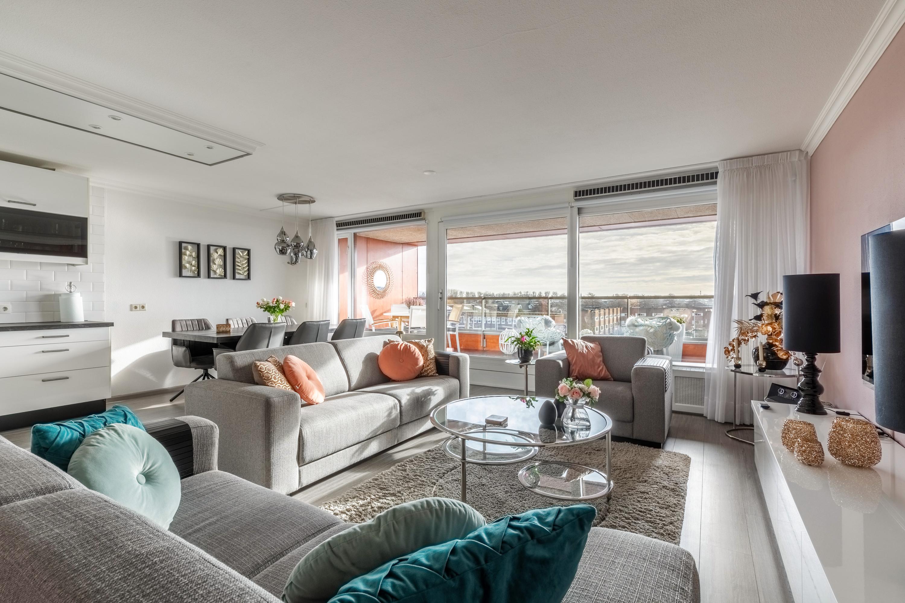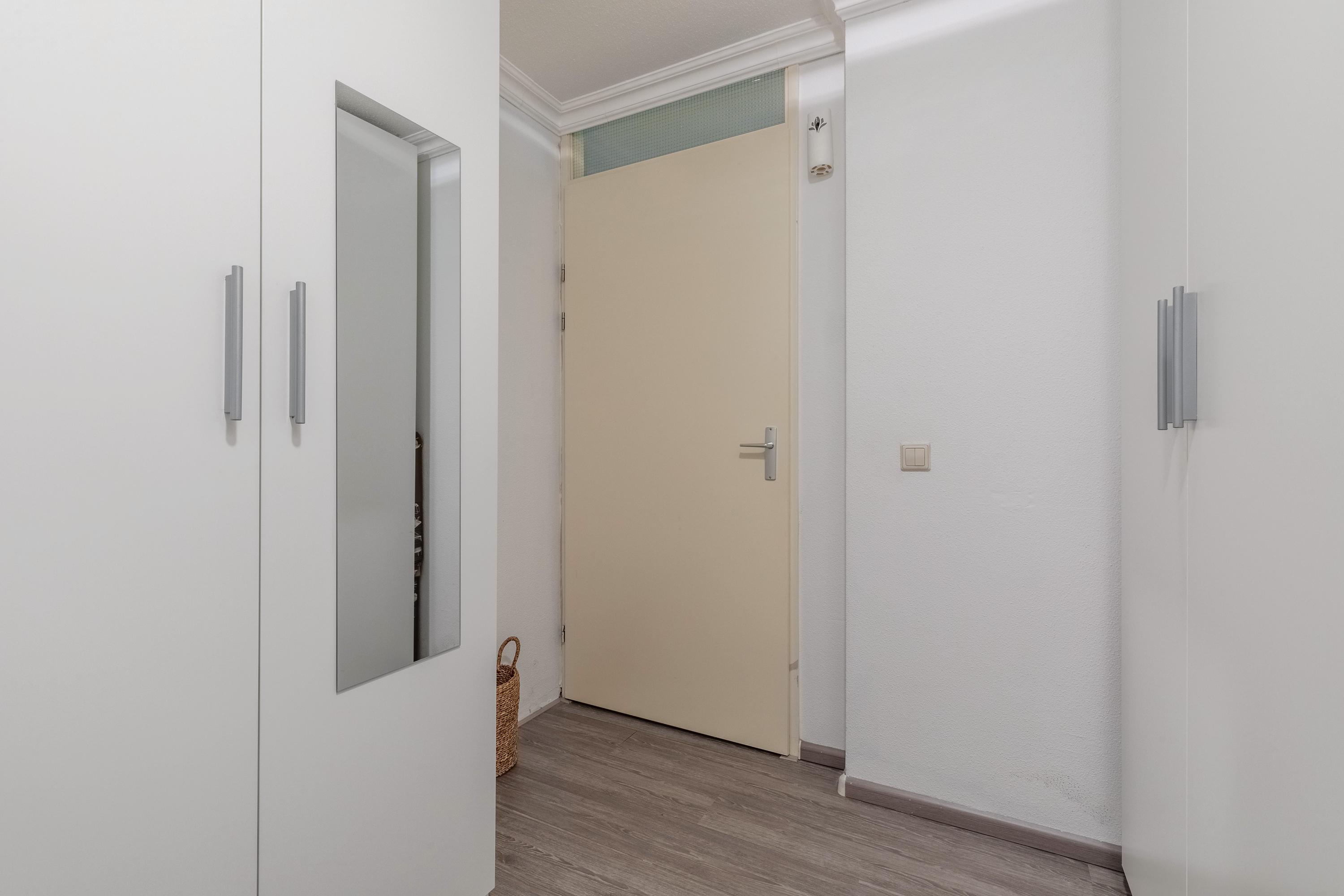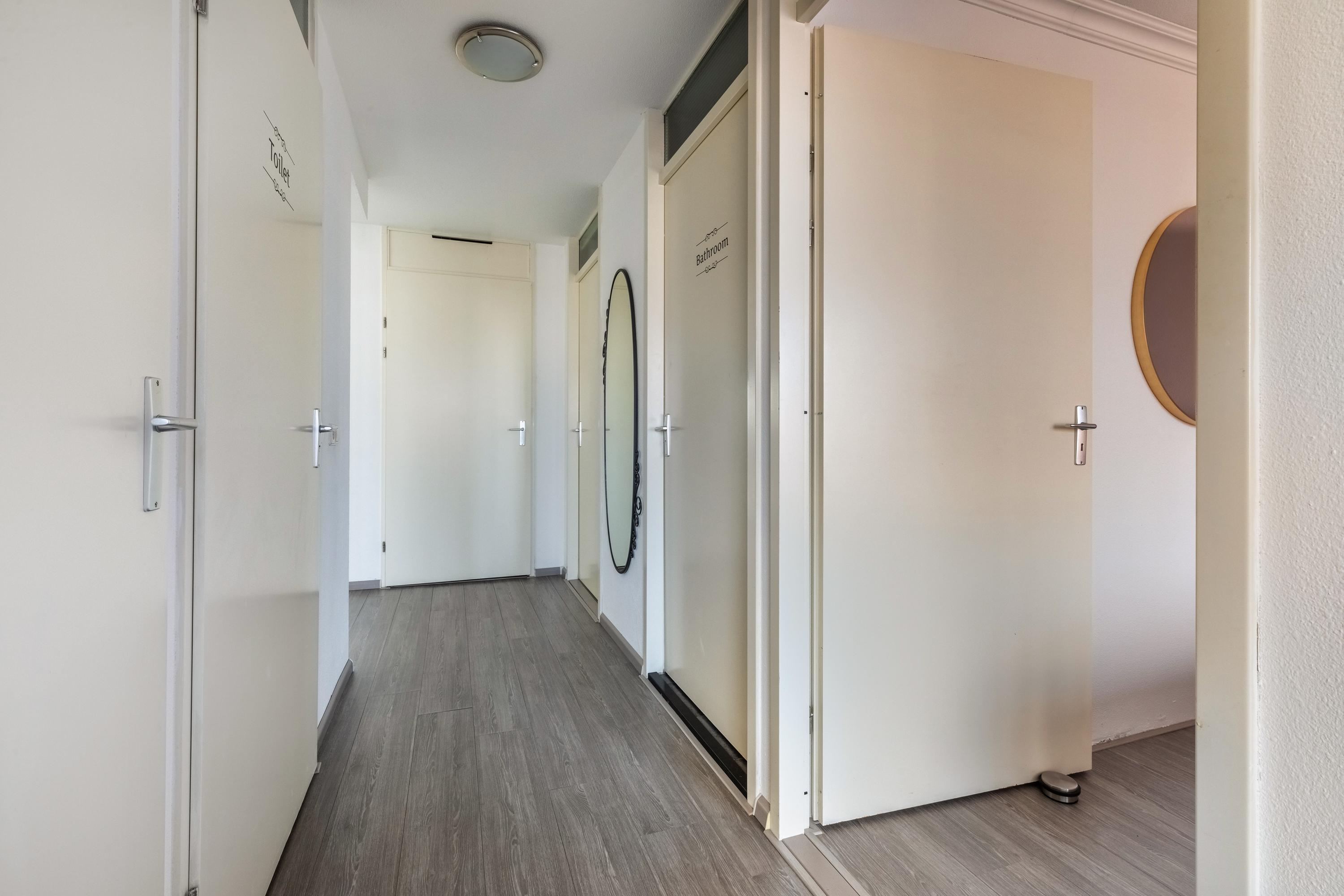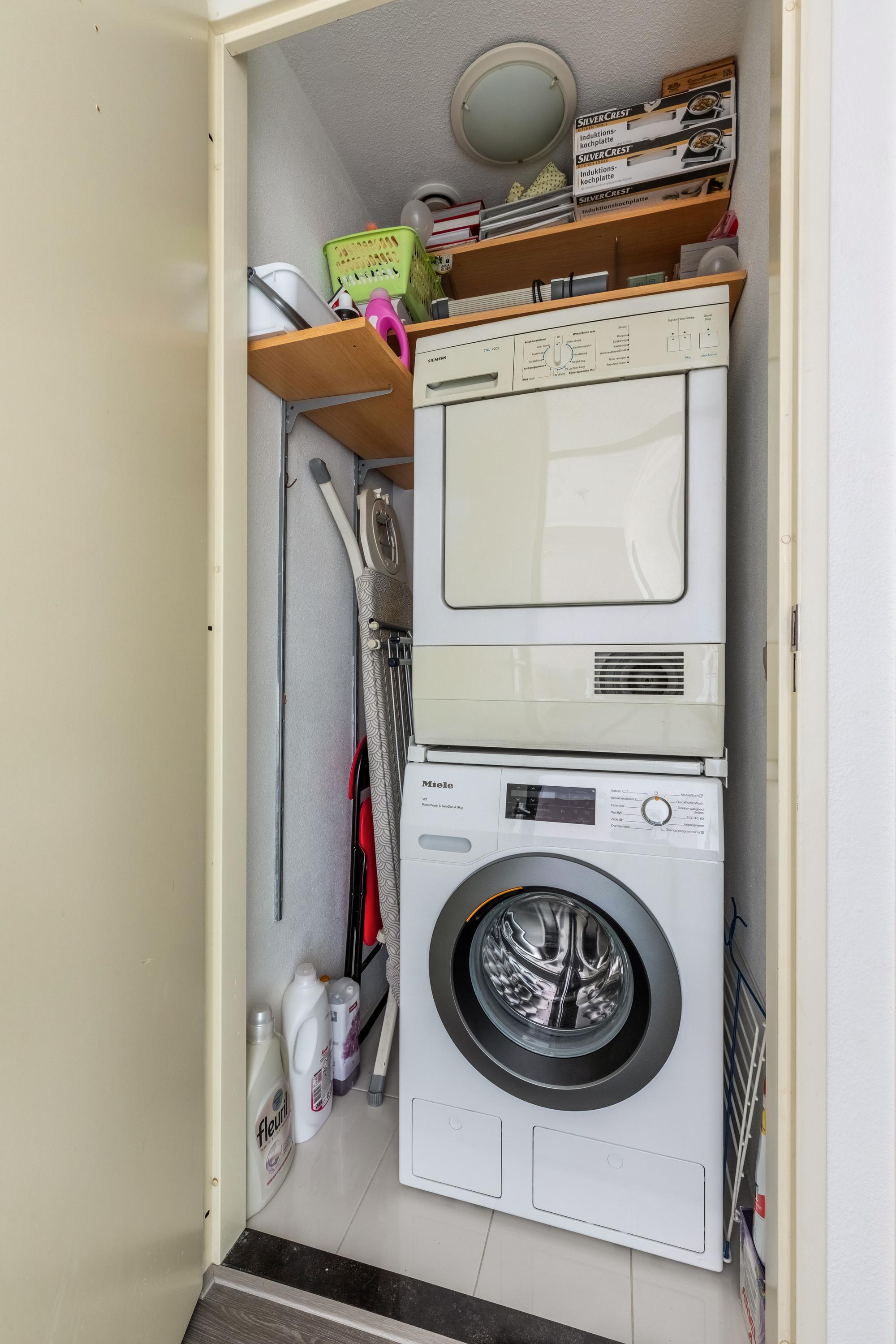 De indeling omvat een afgesloten entree met lift en trap, toegang tot de woning via een hal met garderoberuimte en berging. De ruime woonkamer heeft een nette laminaatvloer, elegante plafondafwerking en een schuifdeur naar het balkon. De moderne keuken is uitgerust met diverse inbouwapparatuur. De woning heeft twee slaapkamers, een inloopkast en een strak betegelde badkamer met inloopdouche. Verder zijn er een apart toilet en diverse opbergmogelijkheden.