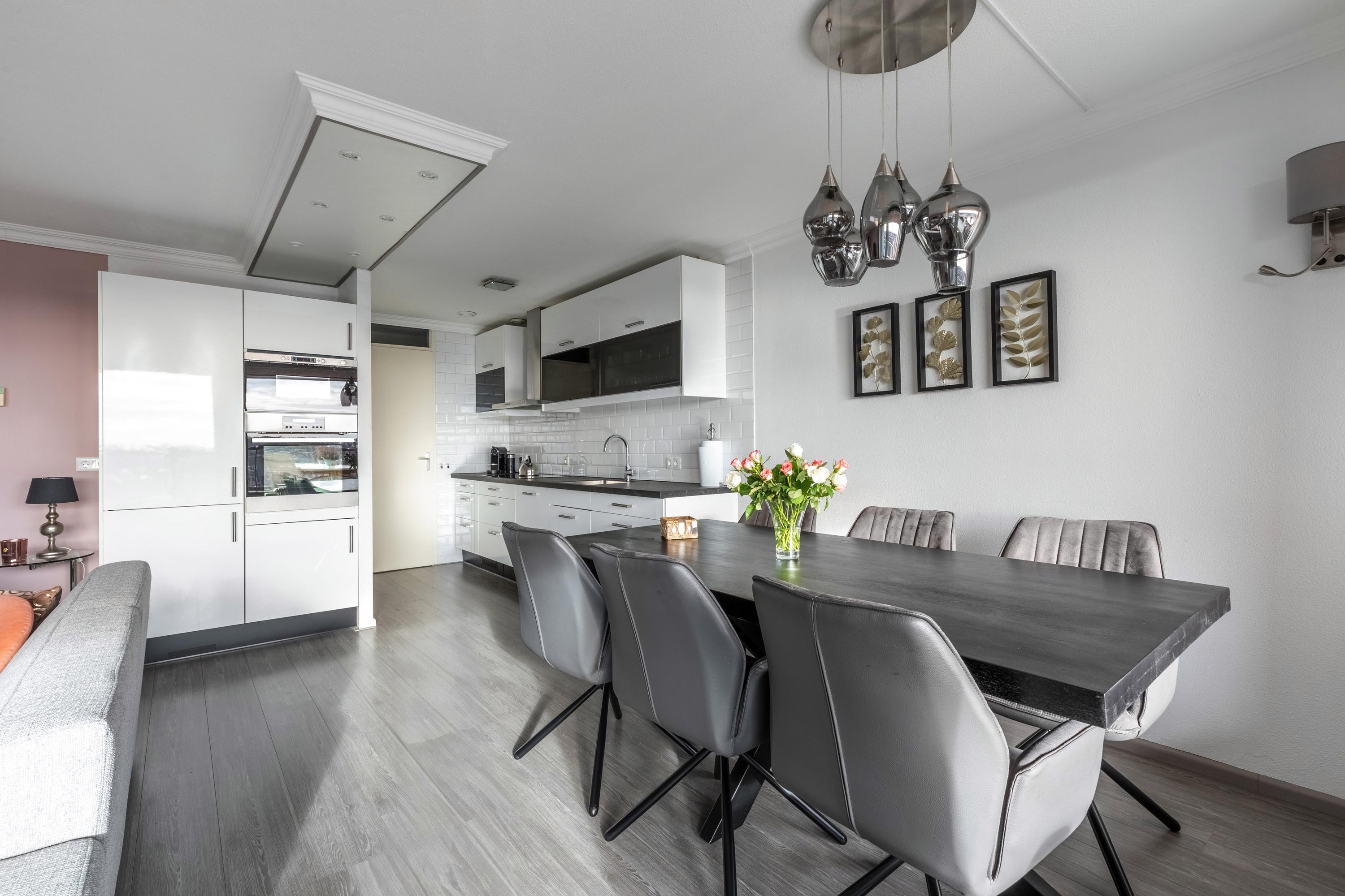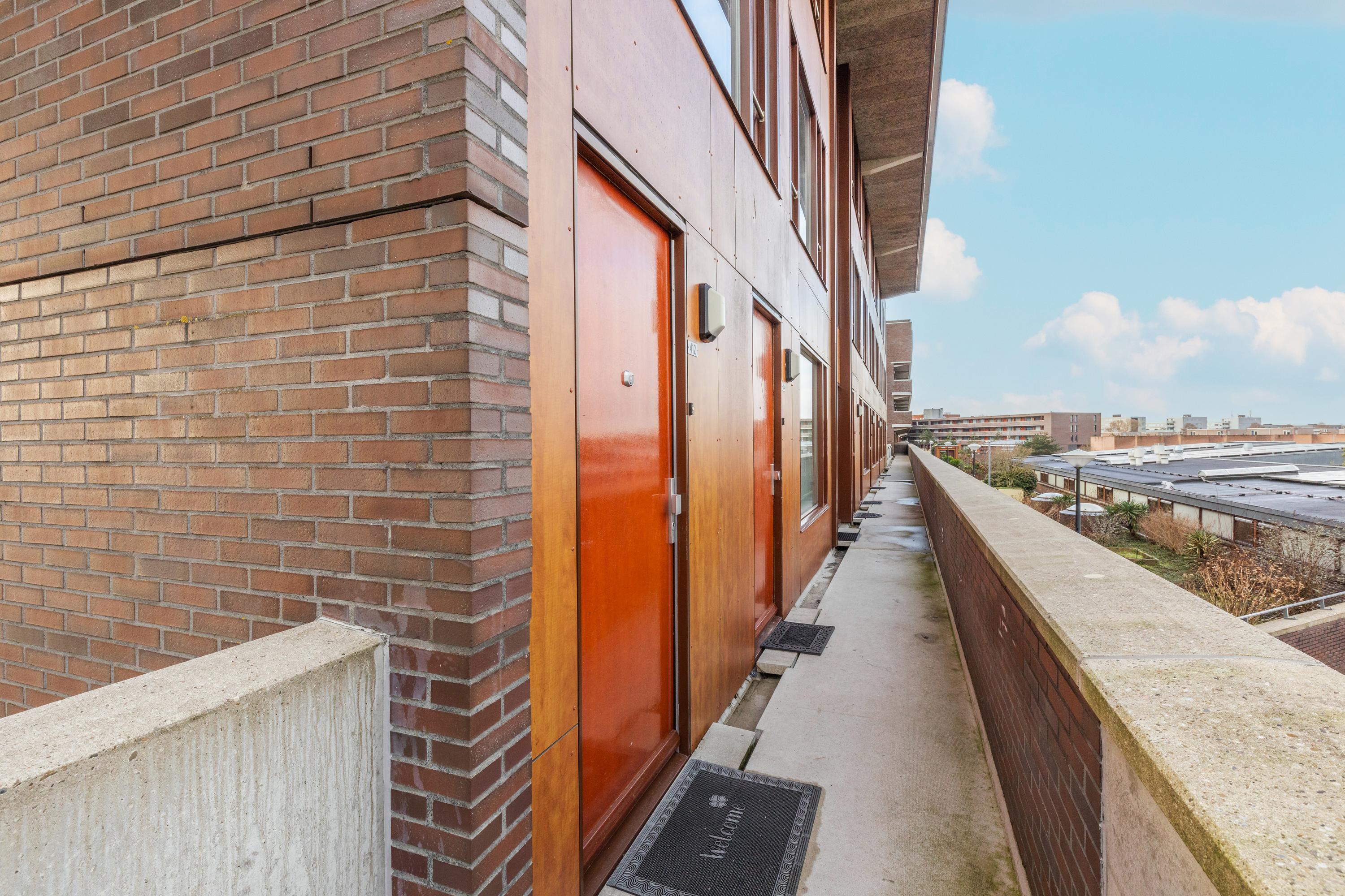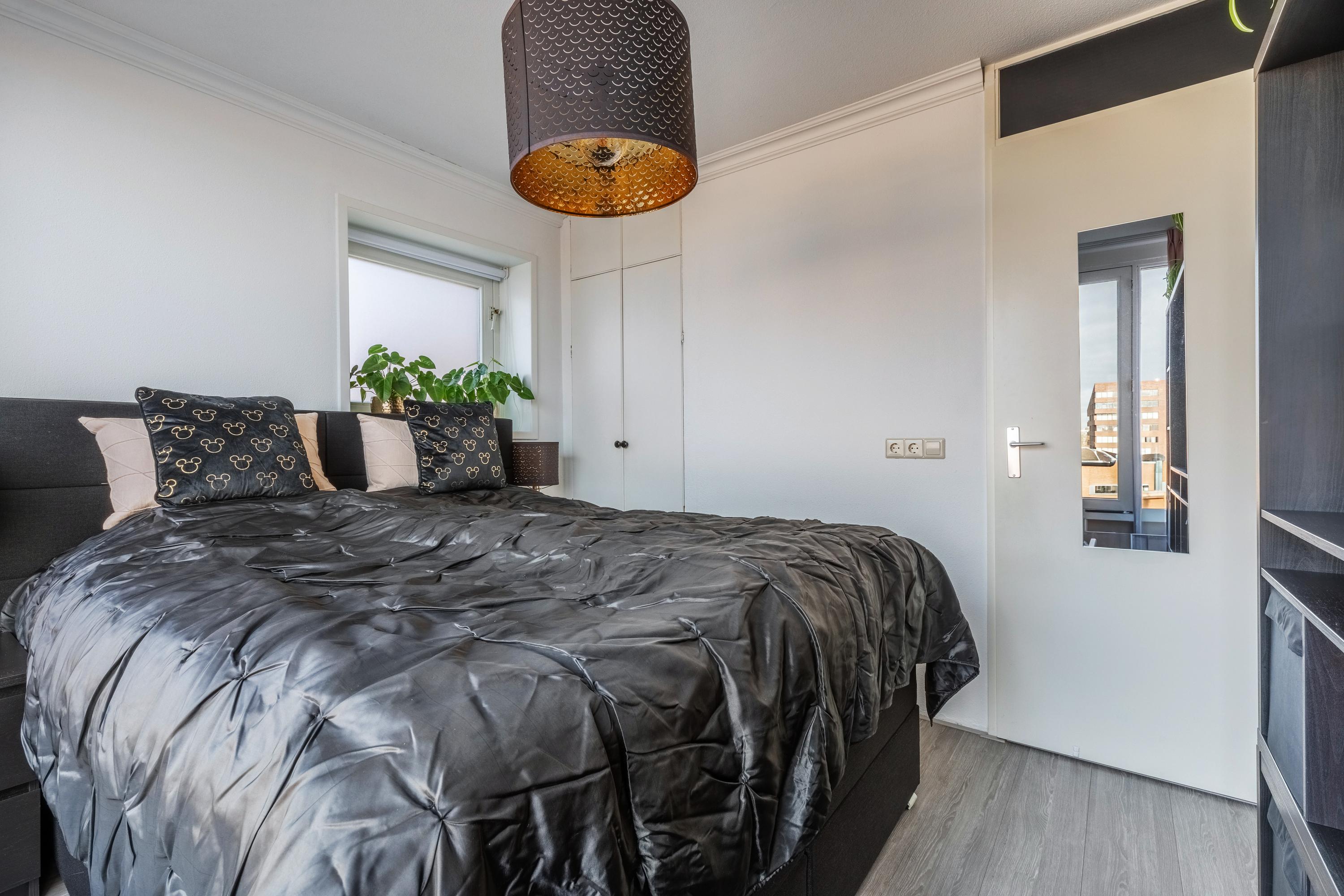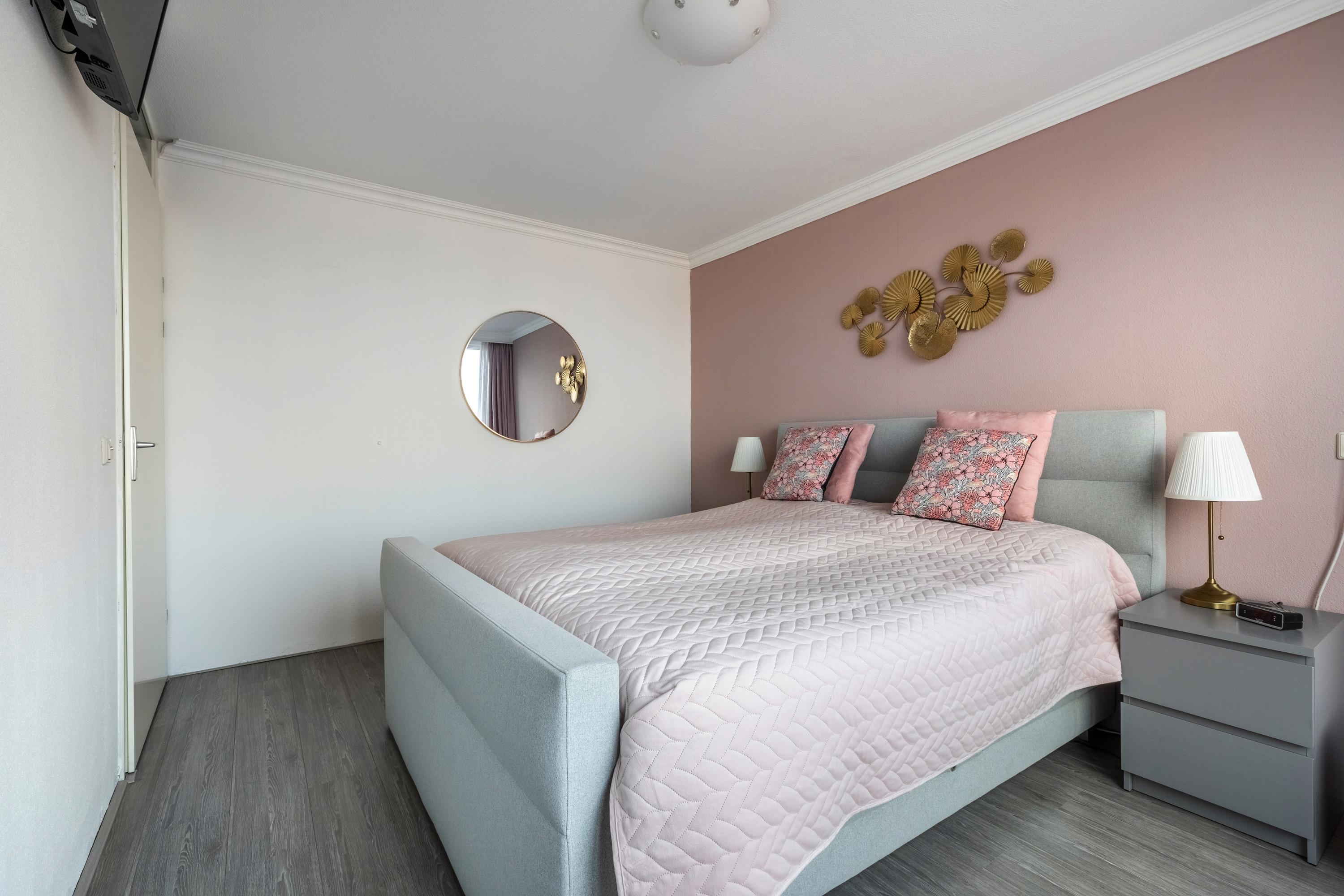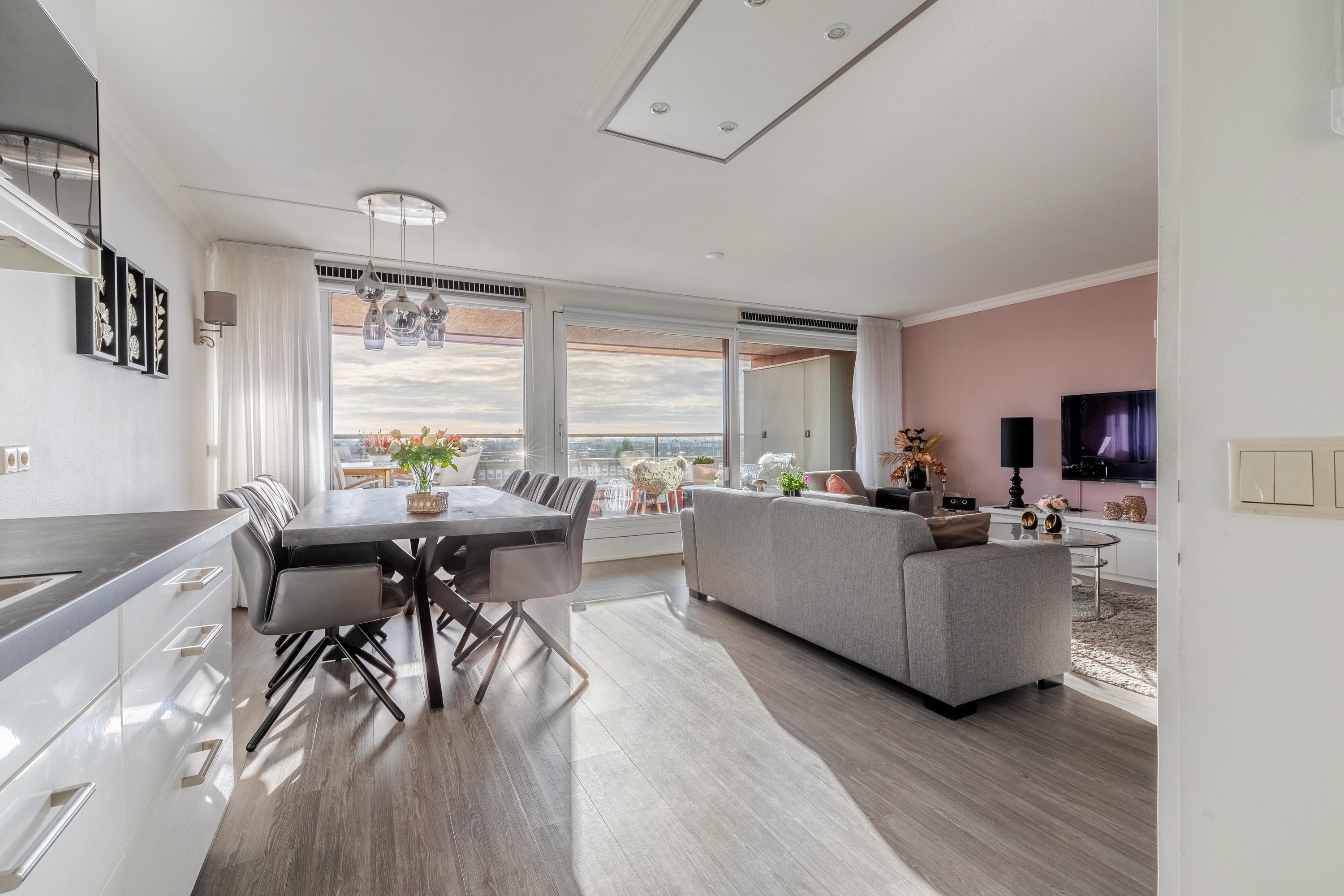 De indeling omvat een afgesloten entree met lift en trap, toegang tot de woning via een hal met garderoberuimte en berging. De ruime woonkamer heeft een nette laminaatvloer, elegante plafondafwerking en een schuifdeur naar het balkon. De moderne keuken is uitgerust met diverse inbouwapparatuur. De woning heeft twee slaapkamers, een inloopkast en een strak betegelde badkamer met inloopdouche. Verder zijn er een apart toilet en diverse opbergmogelijkheden.
