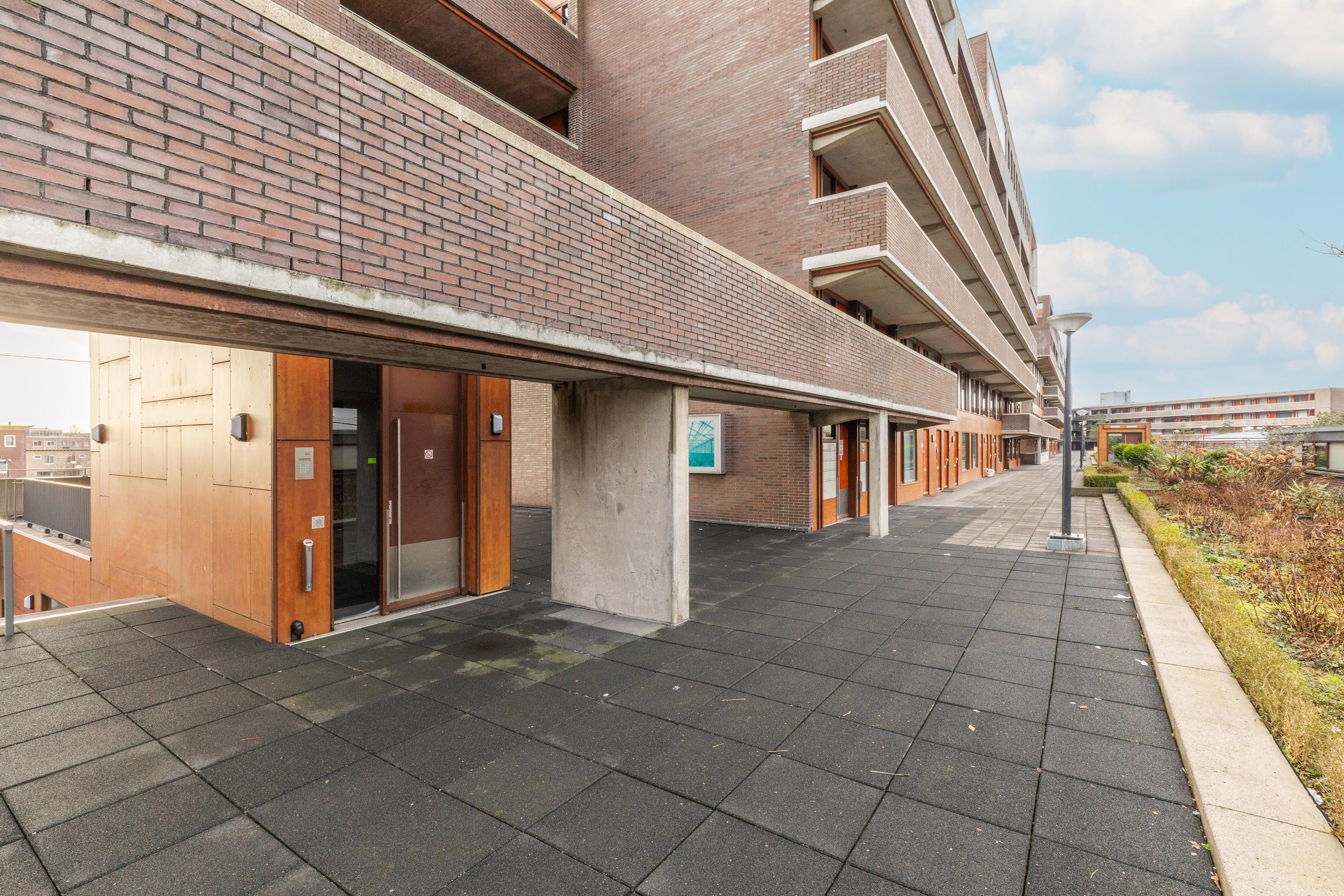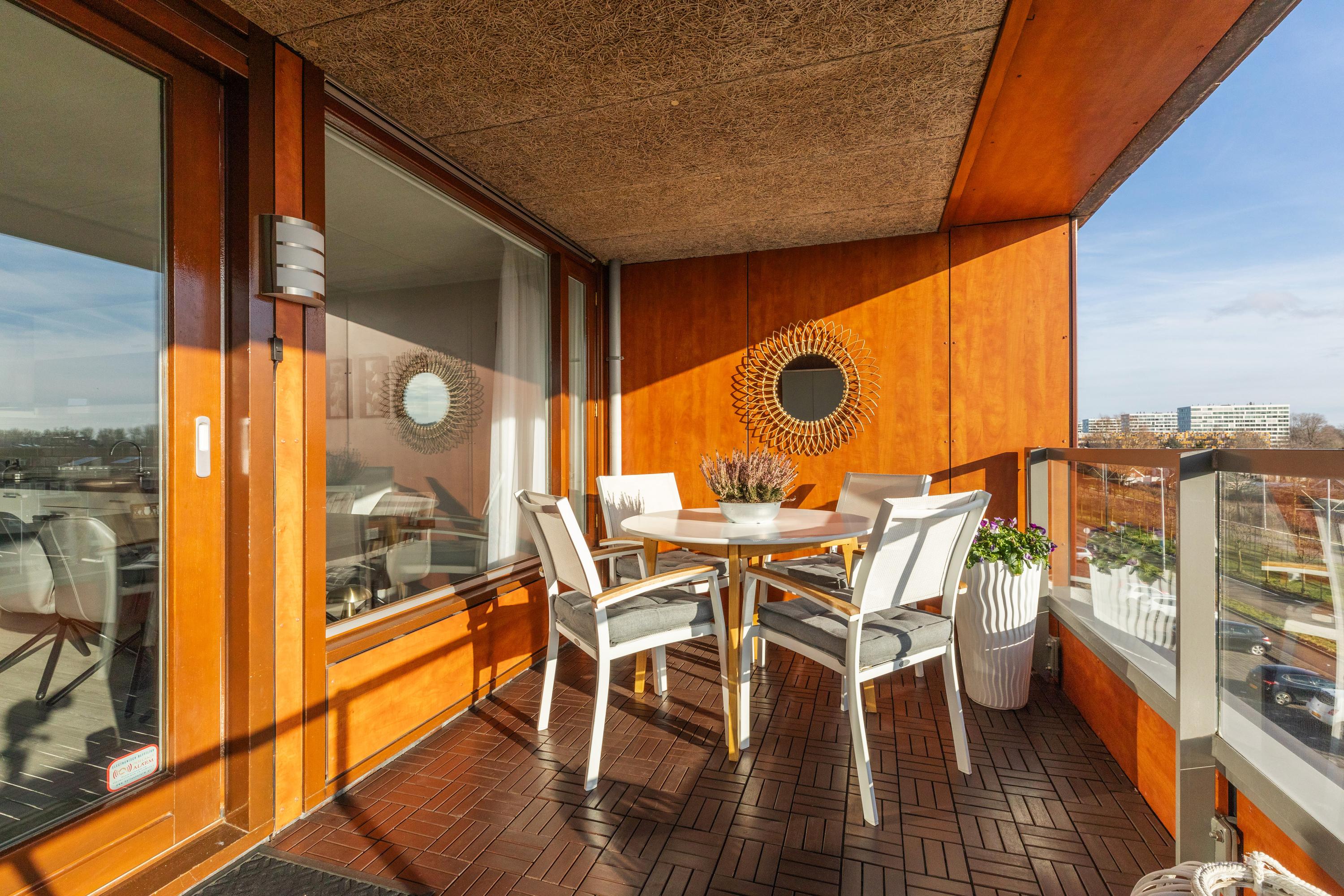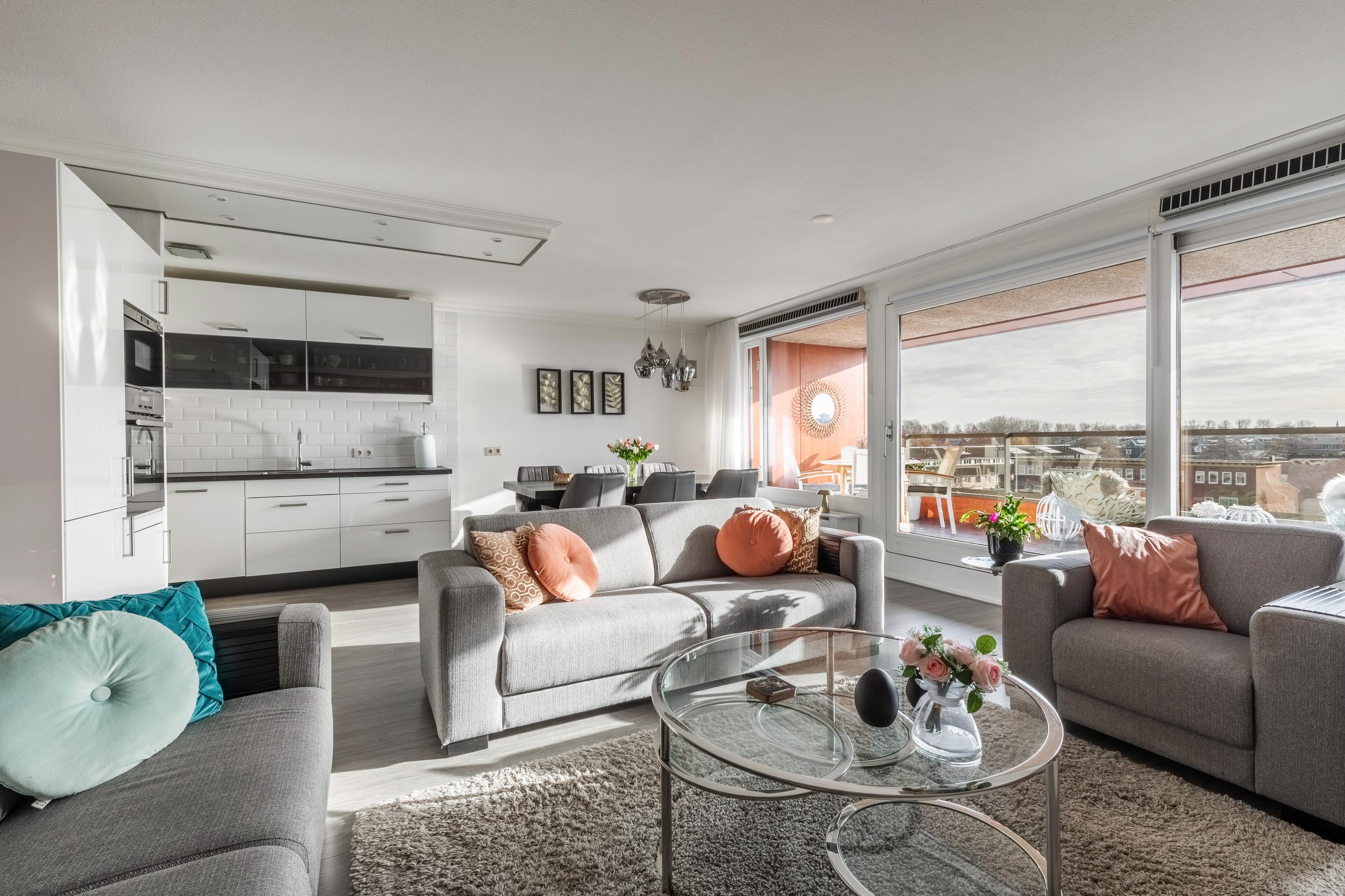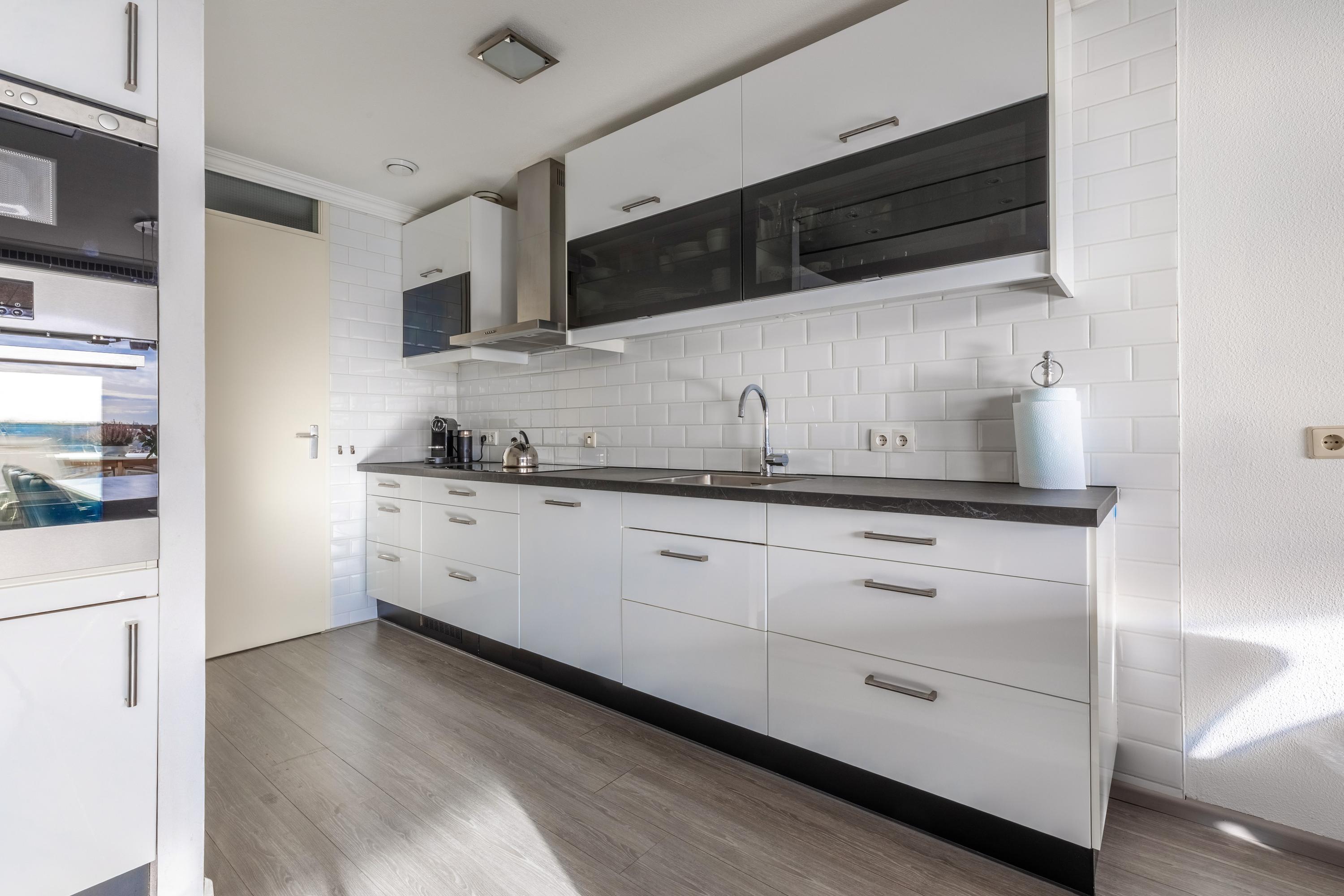 De indeling omvat een afgesloten entree met lift en trap, toegang tot de woning via een hal met garderoberuimte en berging. De ruime woonkamer heeft een nette laminaatvloer, elegante plafondafwerking en een schuifdeur naar het balkon. De moderne keuken is uitgerust met diverse inbouwapparatuur. De woning heeft twee slaapkamers, een inloopkast en een strak betegelde badkamer met inloopdouche. Verder zijn er een apart toilet en diverse opbergmogelijkheden.