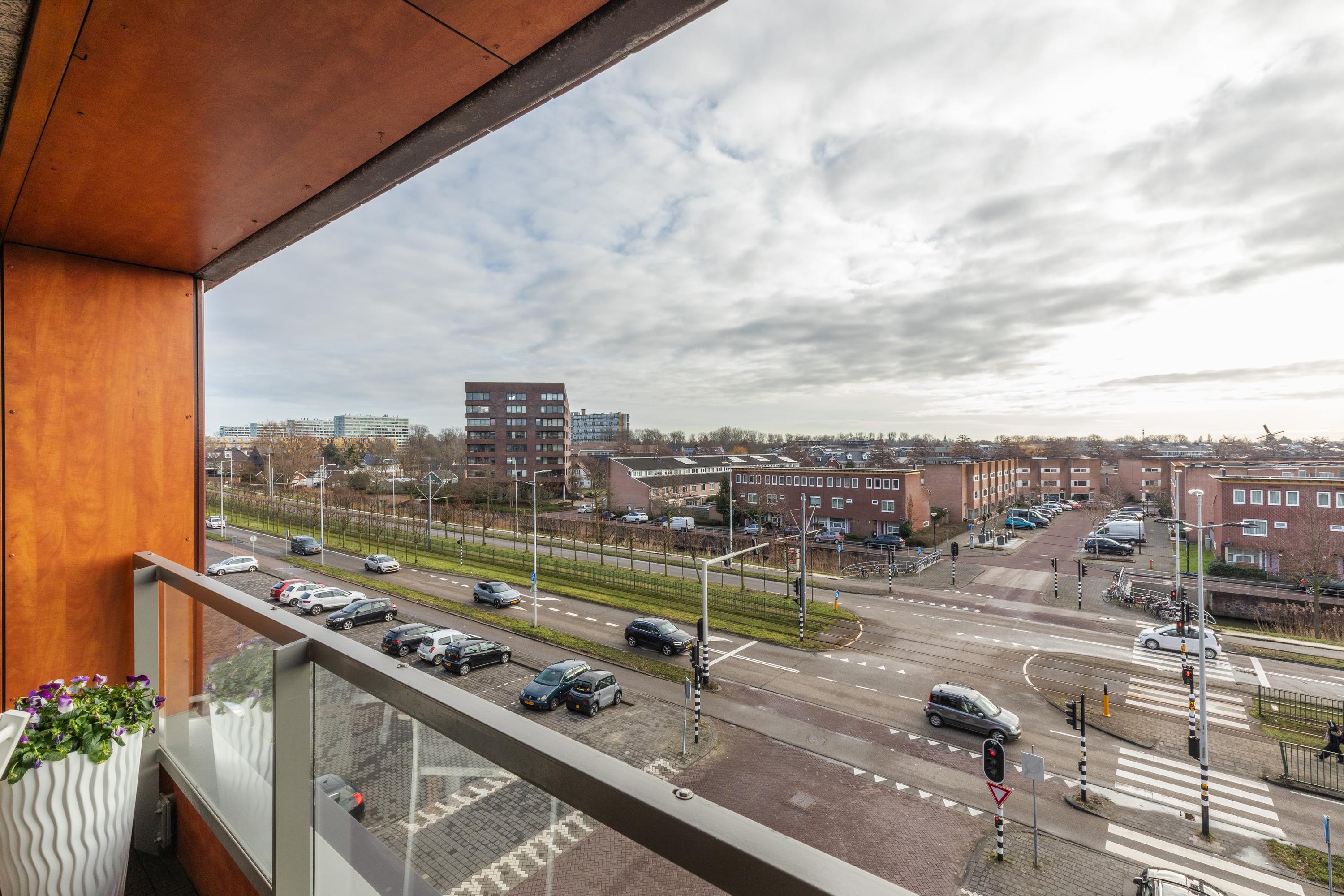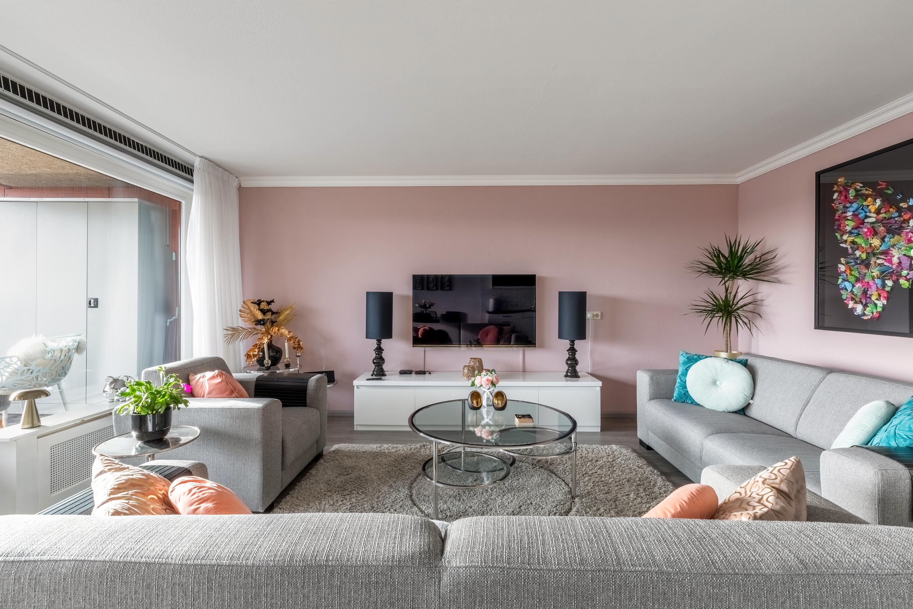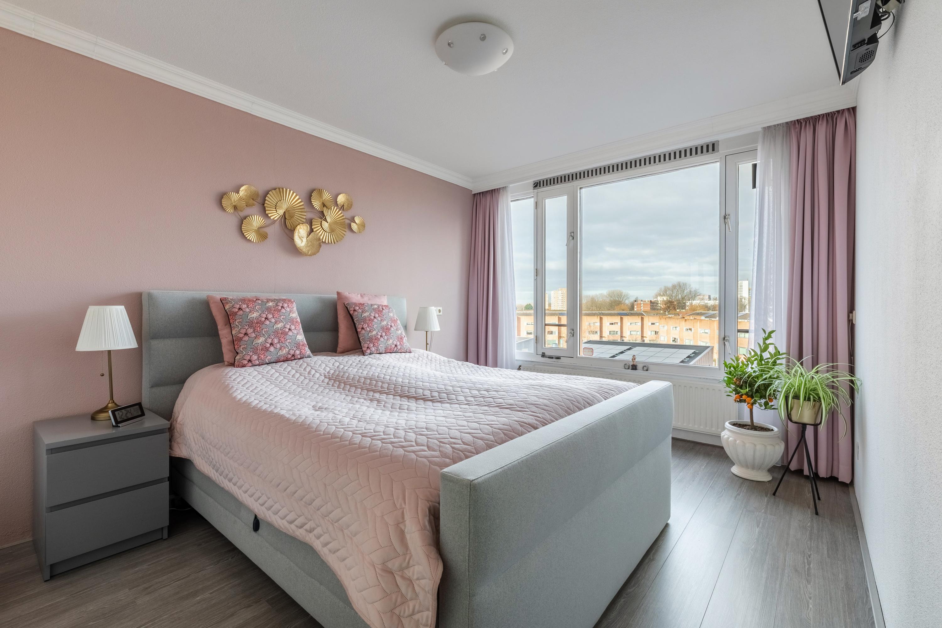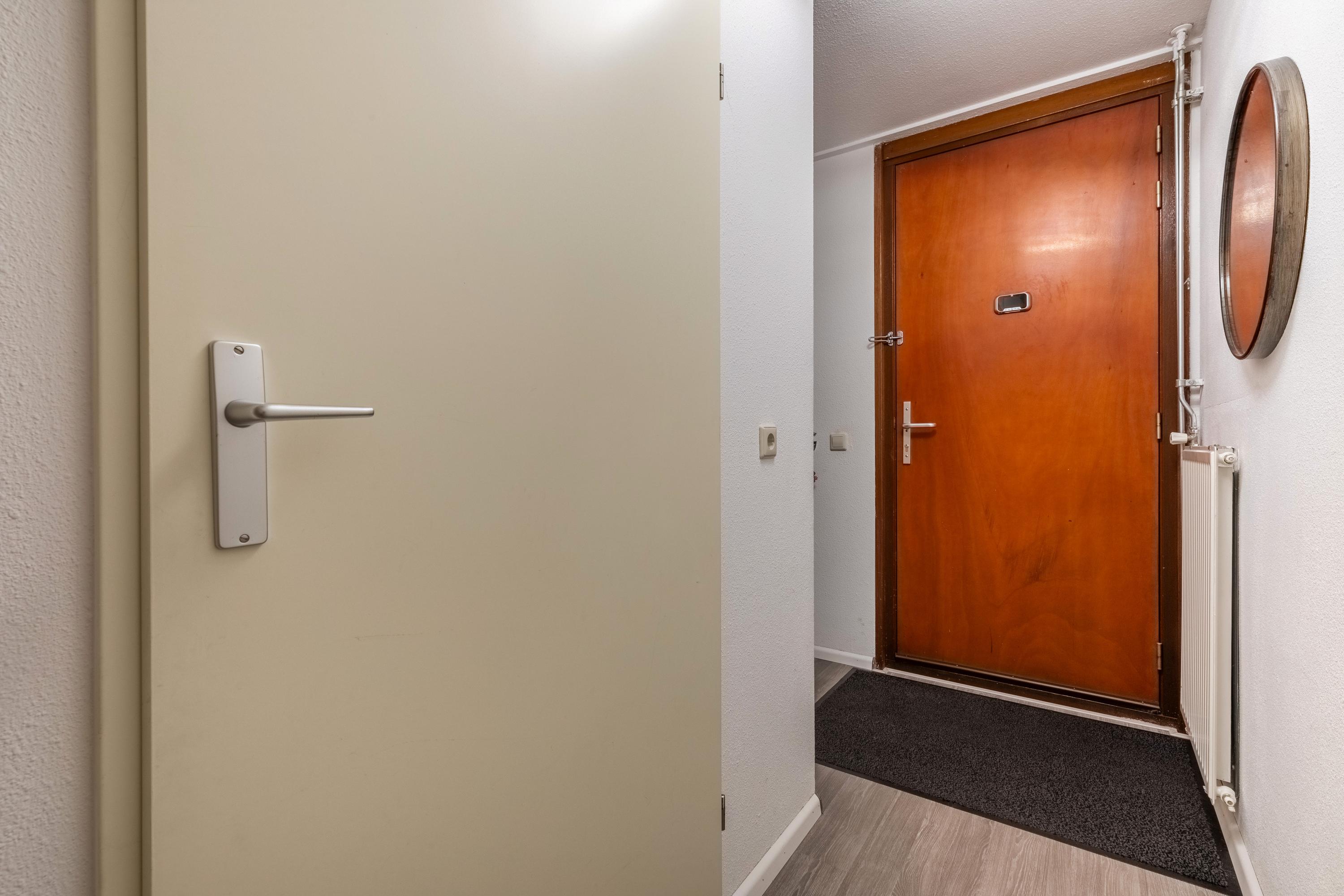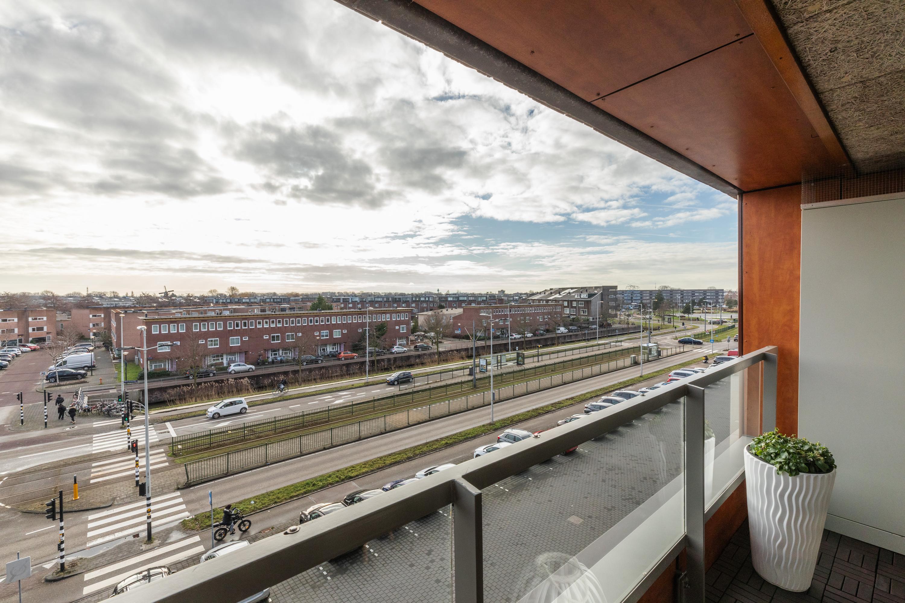 De indeling omvat een afgesloten entree met lift en trap, toegang tot de woning via een hal met garderoberuimte en berging. De ruime woonkamer heeft een nette laminaatvloer, elegante plafondafwerking en een schuifdeur naar het balkon. De moderne keuken is uitgerust met diverse inbouwapparatuur. De woning heeft twee slaapkamers, een inloopkast en een strak betegelde badkamer met inloopdouche. Verder zijn er een apart toilet en diverse opbergmogelijkheden.