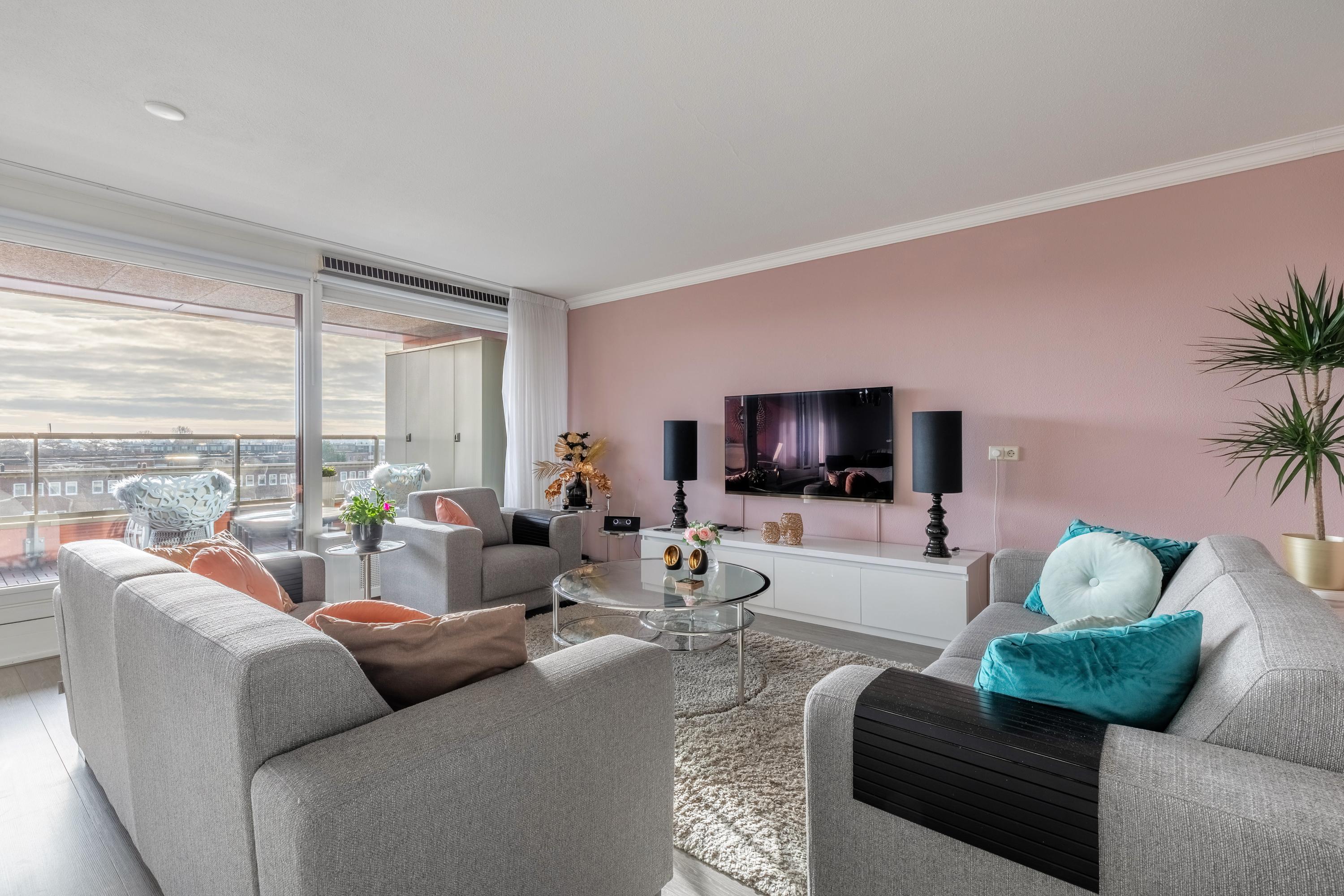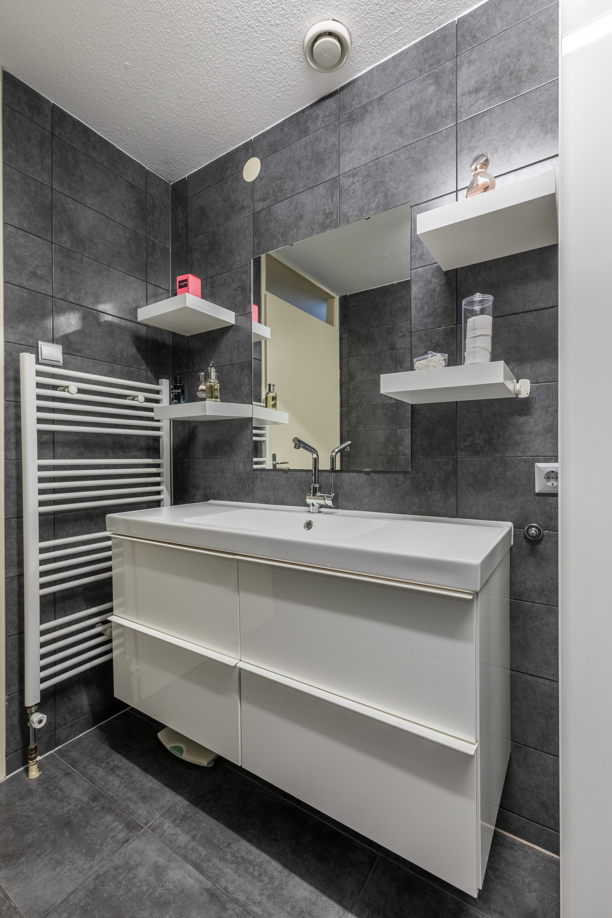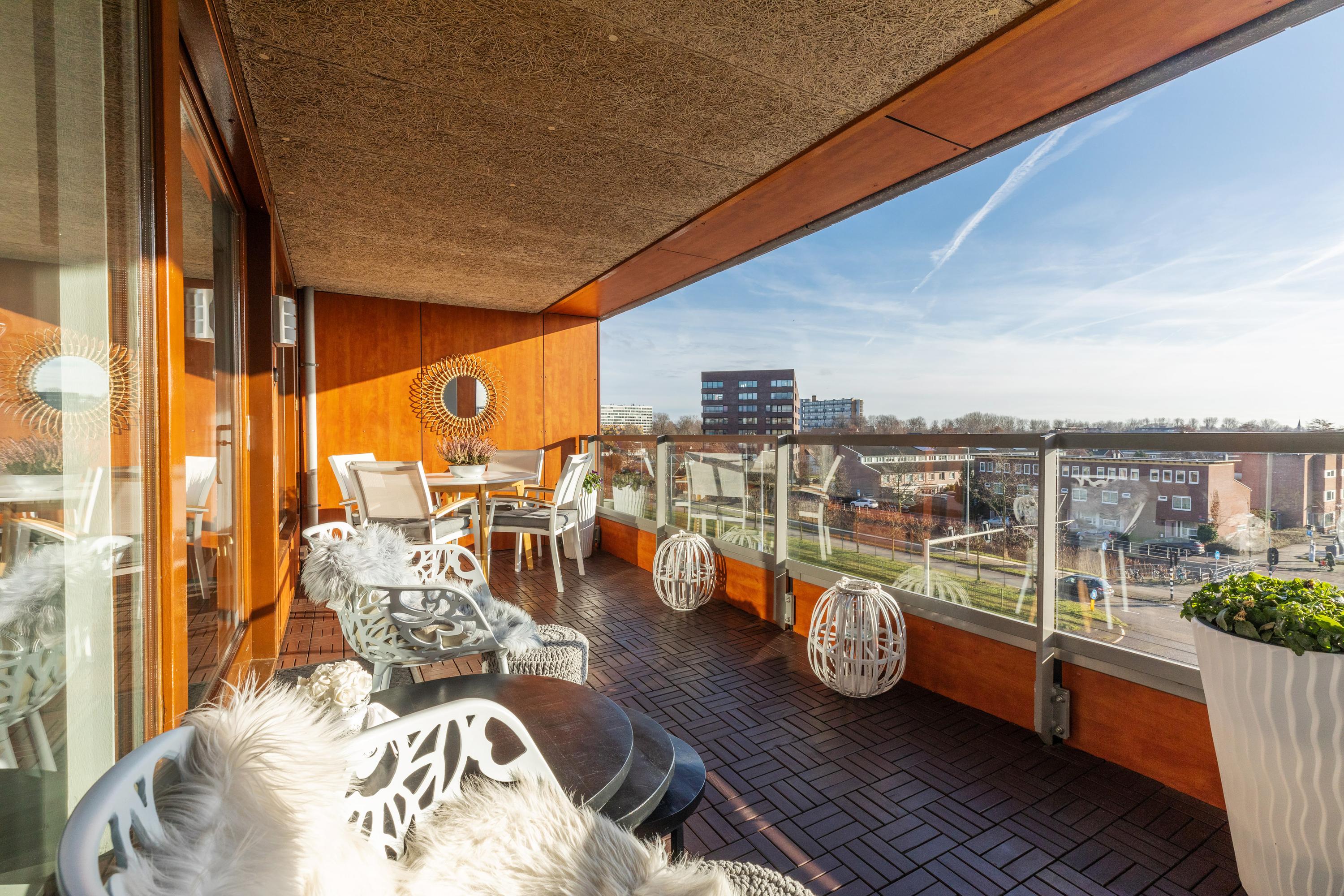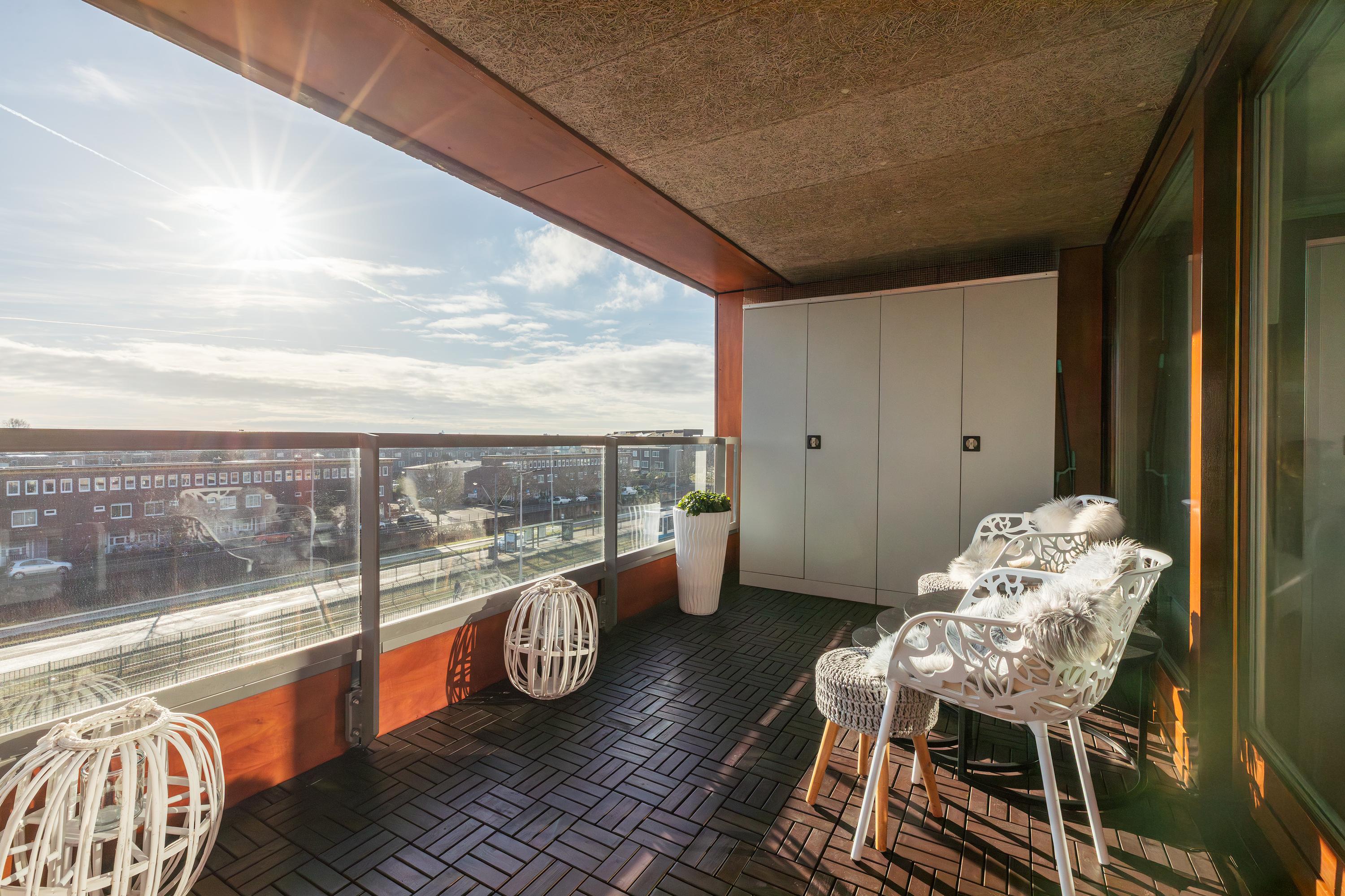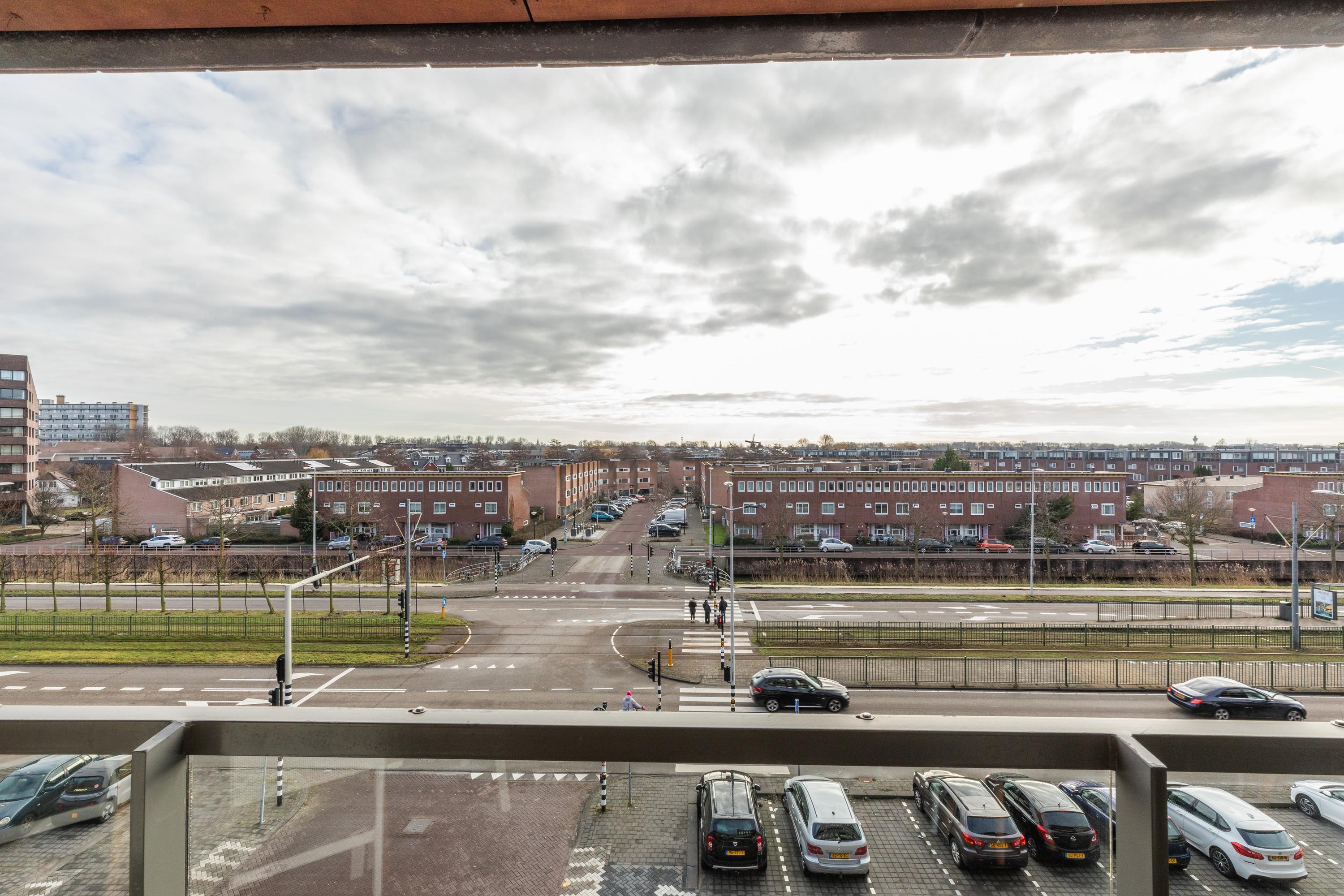 De indeling omvat een afgesloten entree met lift en trap, toegang tot de woning via een hal met garderoberuimte en berging. De ruime woonkamer heeft een nette laminaatvloer, elegante plafondafwerking en een schuifdeur naar het balkon. De moderne keuken is uitgerust met diverse inbouwapparatuur. De woning heeft twee slaapkamers, een inloopkast en een strak betegelde badkamer met inloopdouche. Verder zijn er een apart toilet en diverse opbergmogelijkheden.