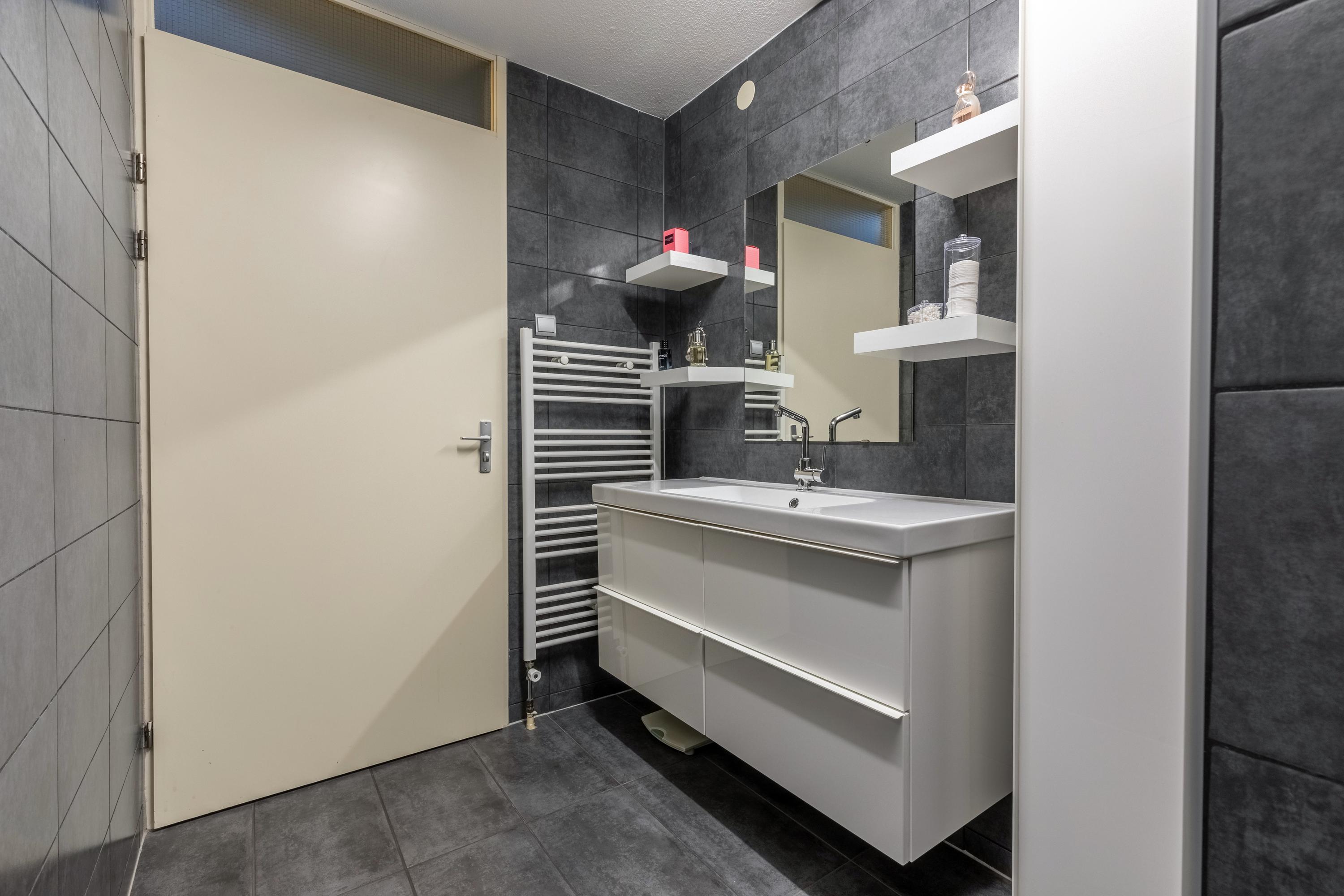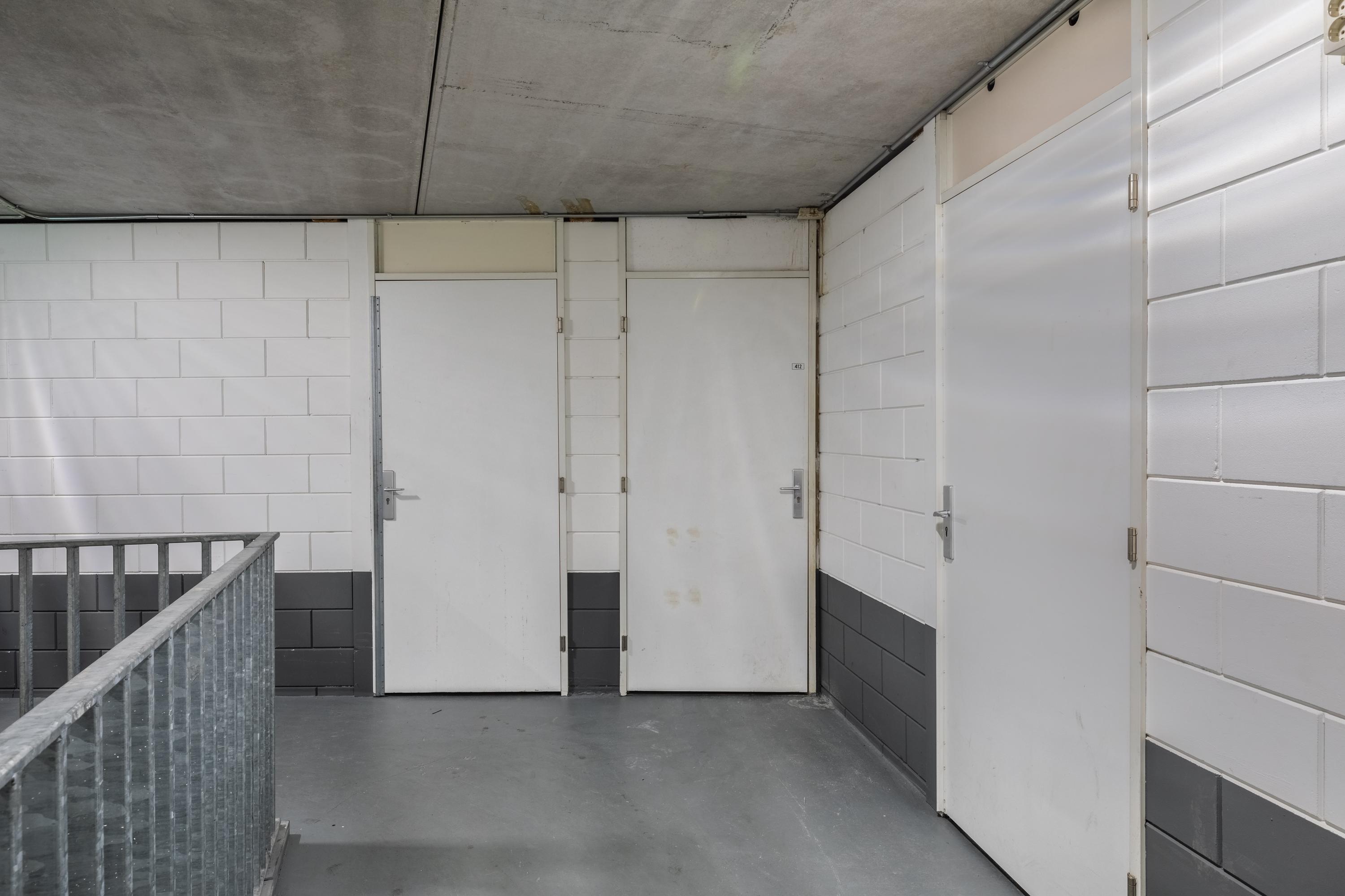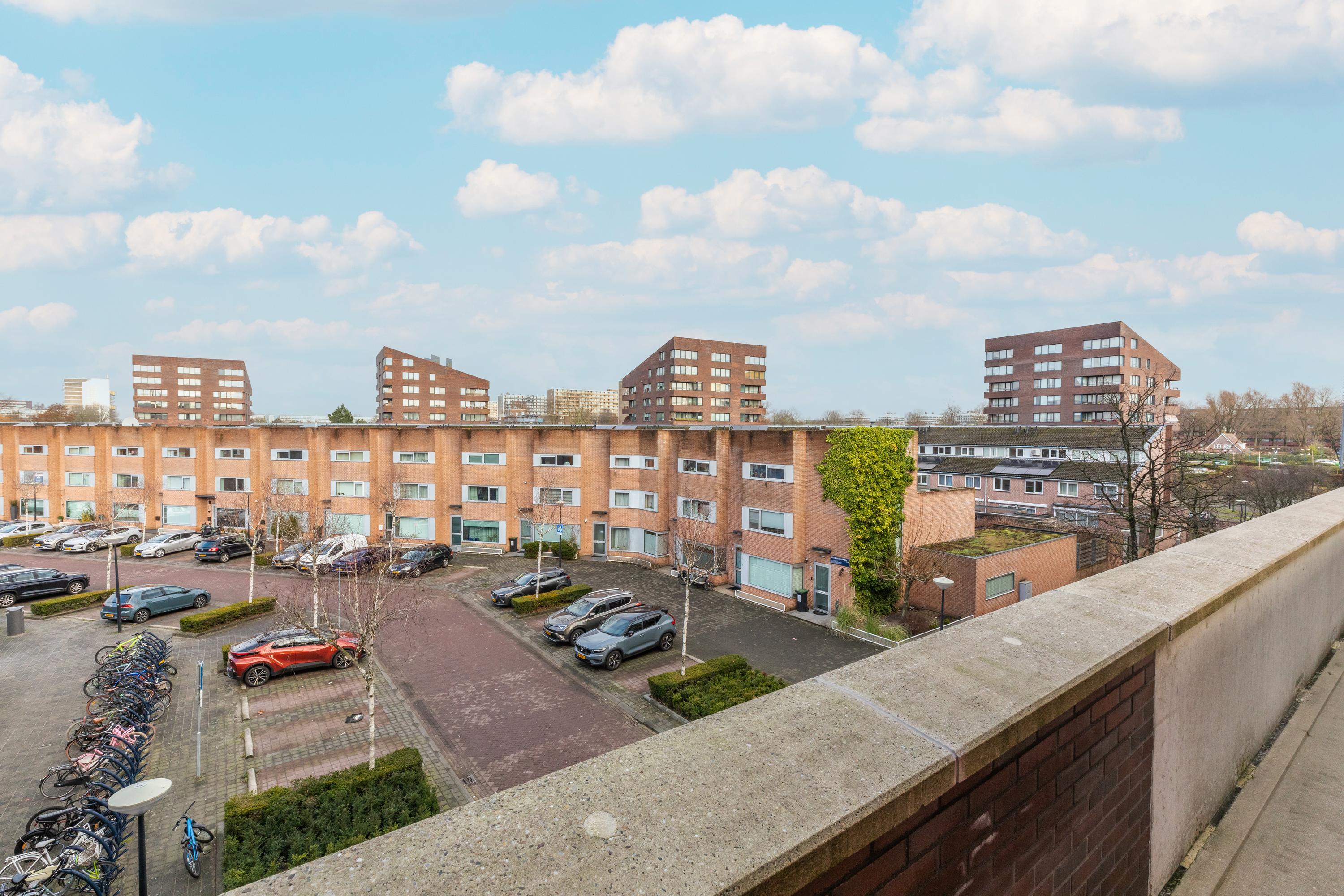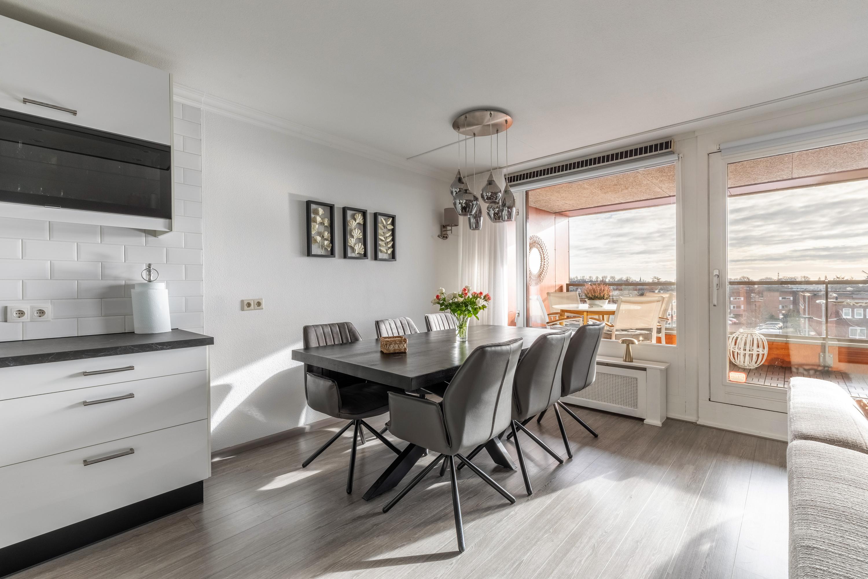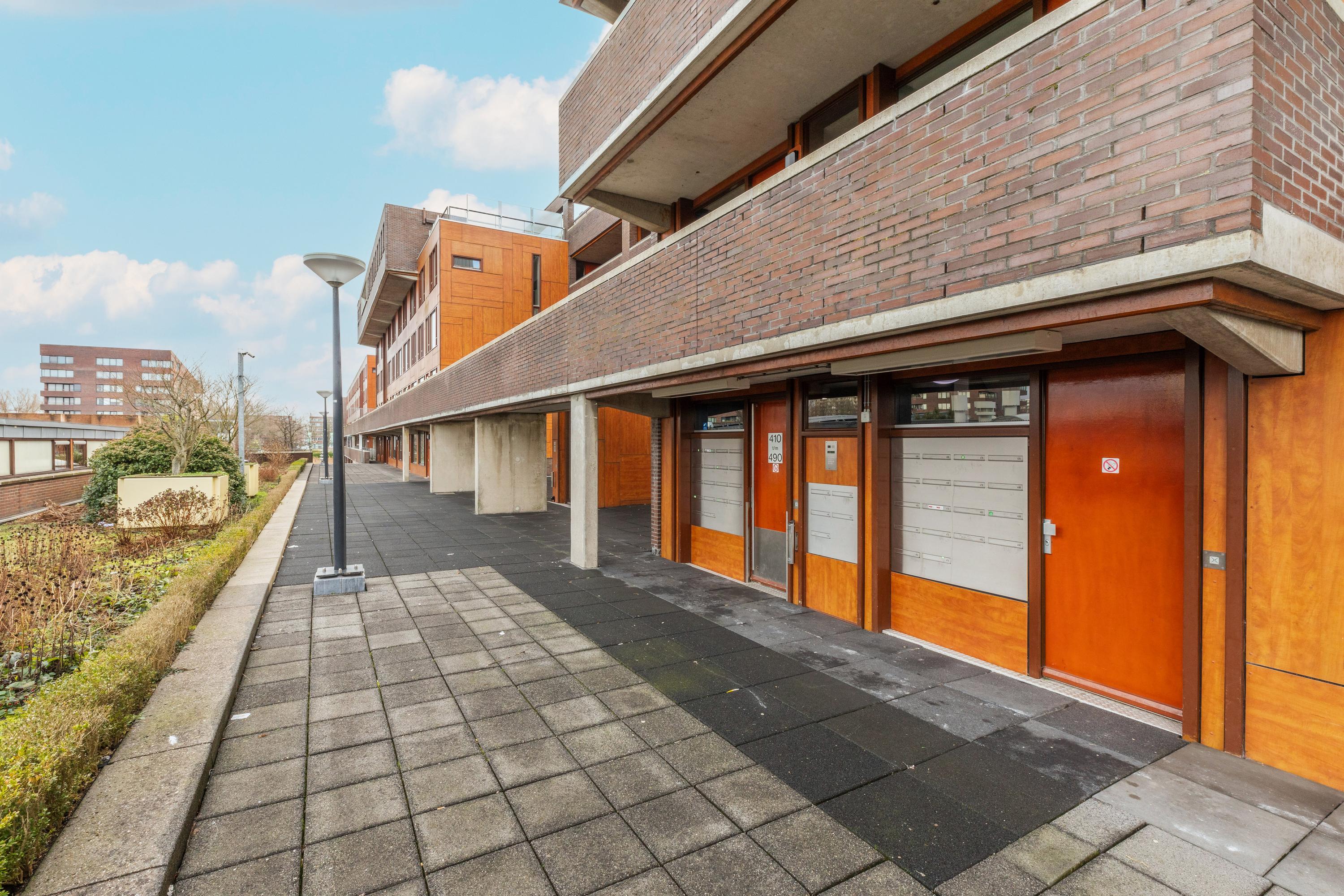 De indeling omvat een afgesloten entree met lift en trap, toegang tot de woning via een hal met garderoberuimte en berging. De ruime woonkamer heeft een nette laminaatvloer, elegante plafondafwerking en een schuifdeur naar het balkon. De moderne keuken is uitgerust met diverse inbouwapparatuur. De woning heeft twee slaapkamers, een inloopkast en een strak betegelde badkamer met inloopdouche. Verder zijn er een apart toilet en diverse opbergmogelijkheden.