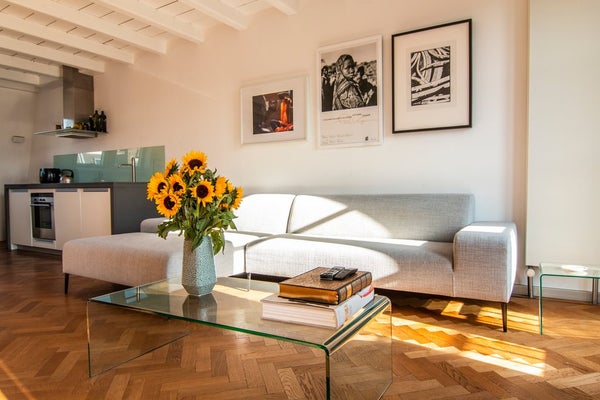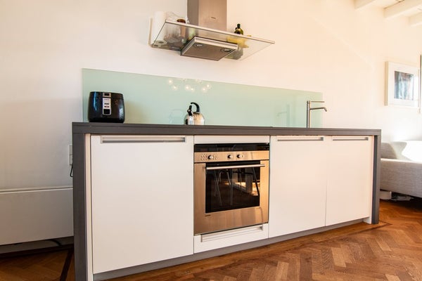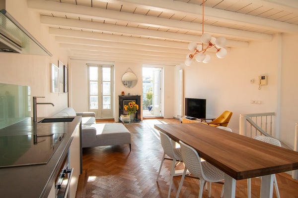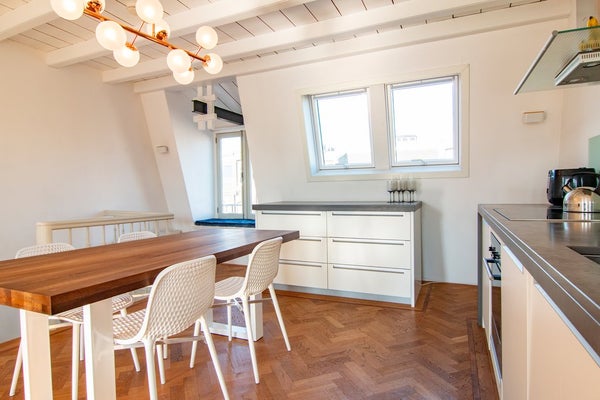 The top floor forms the heart of the apartment: a bright, loft-style living space with a comfortable lounge area, an open-plan kitchen equipped with all necessary built-in appliances, and ample space for a large dining table. From the living room, you step directly onto the sun-drenched roof terrace, which offers plenty of room for a lounge set and is perfect for enjoying long summer days and evenings.