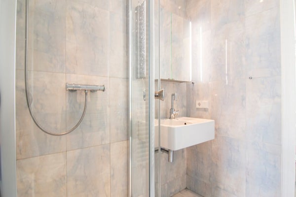The private entrance on the second floor leads via an internal staircase to the third floor, where the sleeping quarters are situated. At the rear is the generous master bedroom, with direct access to a pleasant south-facing balcony. Adjacent is the stylish en-suite bathroom, fitted with a bathtub, washbasin and toilet. The hallway offers a practical laundry area with connections for a washing machine and dryer, as well as a separate toilet. The second bedroom is located at the front of the apartment and has its own bathroom with shower and washbasin, making it ideal as a guest room or home office.