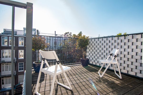 This exceptionally well-located duplex apartment of approximately 125 m² features two balconies, a spacious roof terrace, and no less than four bedrooms and two bathrooms. It is prepared to install an elevator, making this property even more appealing. Situated on the square overlooking Cornelis Schuytstraat, it's an ideal location, sheltered yet prominent. And just a stone's throw from the best shops, restaurants, and Vondelpark!