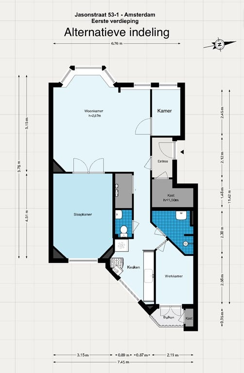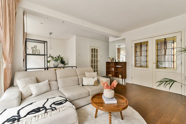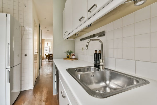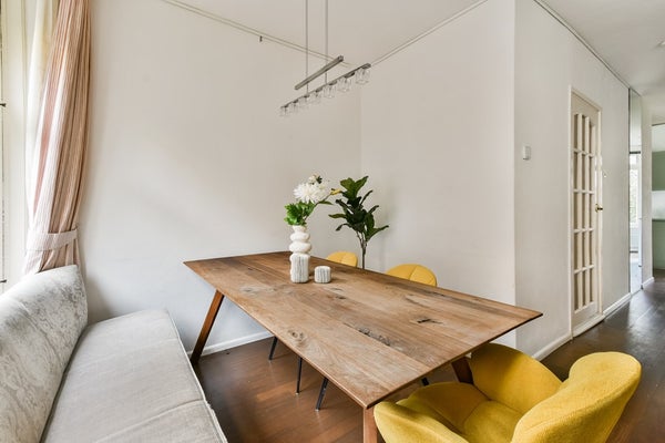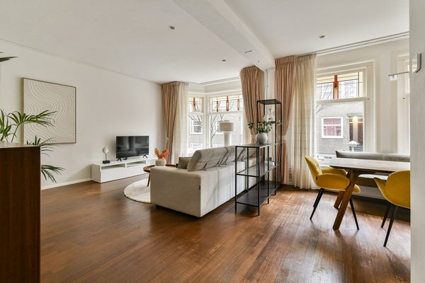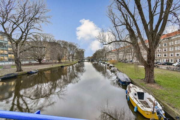 De brede en lichte woonkamer met eetgedeelte is gelegen op het westen en voelt dankzij de hoge plafonds extra ruim aan. Vanuit de zithoek is er een aangenaam zijzicht op het Zuider Amstelkanaal.