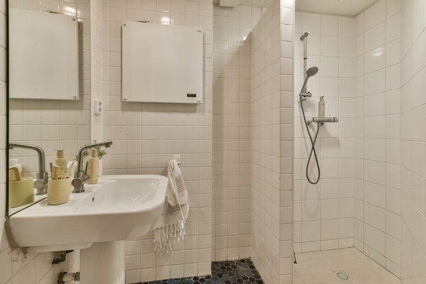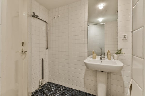 De badkamer is voorzien van een wastafel, een inloopdouche en een aansluiting voor de wasmachine. Daarnaast is er een separaat toilet, bereikbaar vanuit de hal.