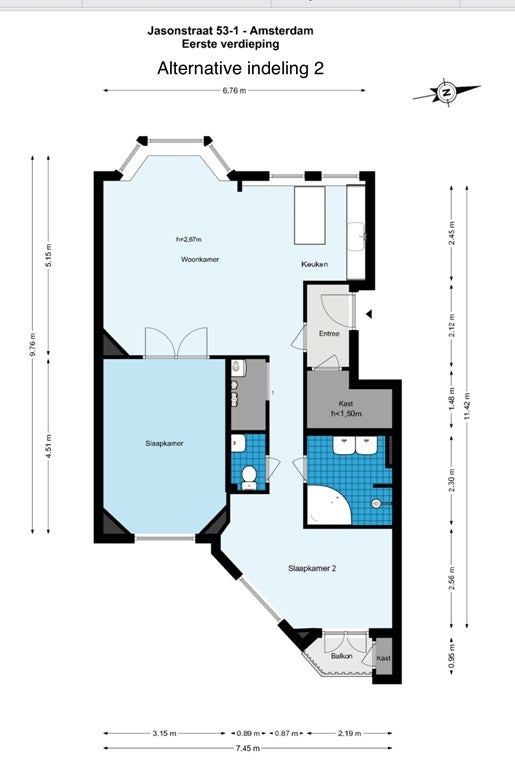 De keuken is een separate ruimte, los van de woonkamer. Aan de achterzijde van de woning bevindt zich de tweede slaapkamer, van waaruit toegang is tot het balkon van circa 1,5 m², gelegen op het oosten.