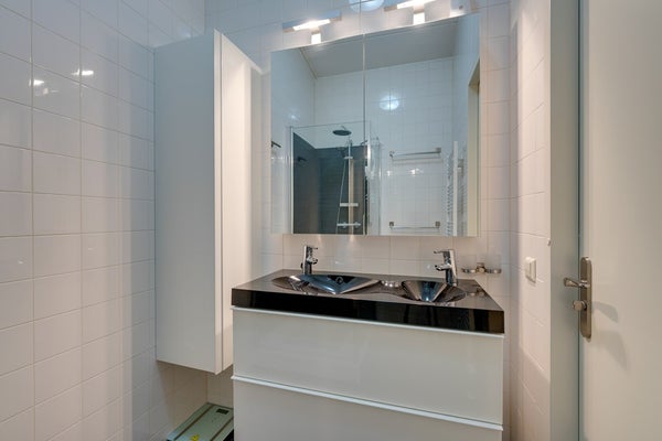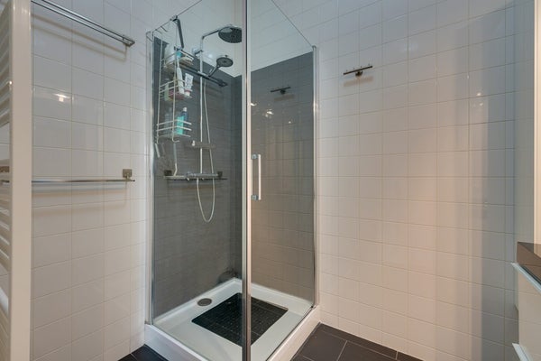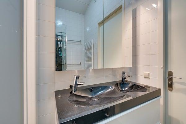 - Moderne badkamer met douchecabine (regen- en handdouche), dubbele wastafel met meubel en spiegelkast.