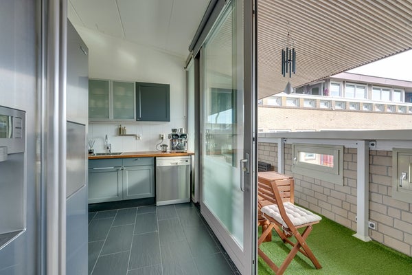 - Stijlvolle keuken in hoekopstelling, voorzien van diverse inbouwapparatuur en schuifpui naar het balkon.