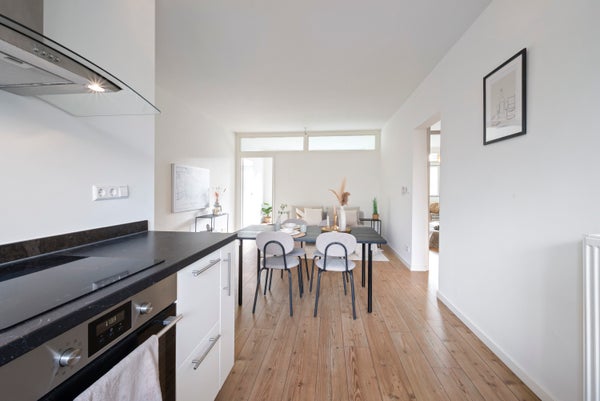 The apartment is located on the 3rd floor of the complex and is accessible by both lift and stairs. Upon entering, you step into the hallway, which provides access to the open-plan living room and kitchen. The kitchen is equipped with an induction hob, built-in oven and dishwasher. Adjacent to the kitchen is a practical utility room housing the fridge-freezer combination. From the living room, the first bedroom can be accessed, which also provides access to the balcony. The balcony extends across almost the entire width of the apartment and offers a pleasant spot to enjoy sunny days with views over the city. The second bedroom is accessible via an intermediate hallway, which also leads to the modern bathroom. The bathroom is fitted with connections for both a washing machine and a dryer.