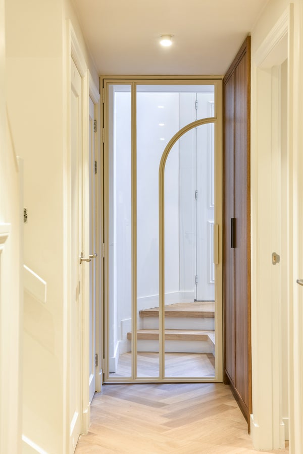Atmospheric living and dining area. At the front, a playful and surprising mezzanine has been created that connects visually with the hallway. Luxurious open-plan kitchen with sink island and modern built-in appliances. At the rear, double French doors open onto a spacious and pleasant terrace with beautiful views over the surrounding inner gardens. Large and practical storage cupboard.