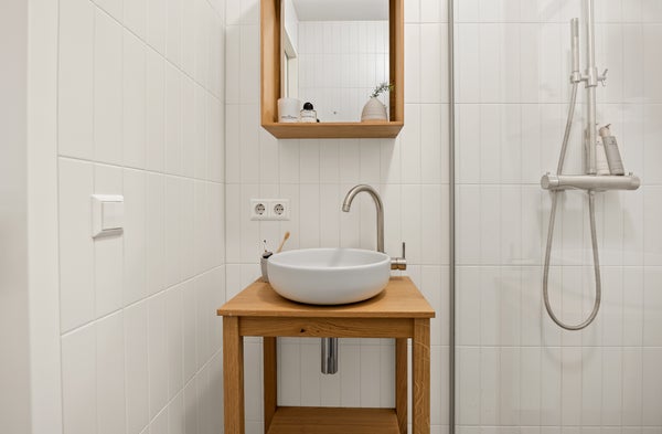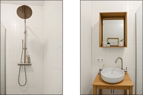 The bathroom features a walk-in shower, wooden vanity with mirror, and timeless floor-to-ceiling tiling. A separate toilet, finished in the same style, includes a wall-mounted WC and small sink.