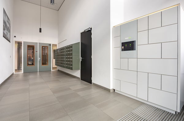 Spacious entrance with high ceilings, video intercom, a stylish wall with Bringme boxes, mailboxes, and access to two elevators.