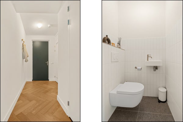 Entree tot de woning. Via een brede hal is er toegang tot alle vertrekken. De woonkamer is heerlijk ruim en licht door de grote raamkozijnen in voor- en zijgevel. Vanuit de woonkamer is er een schitterend uitzicht op het IJ en de omgeving. De luxe en moderne open keuken is uitgevoerd in hoekopstelling en beschikt over een 4-pits inductiekookplaat, combi-oven, koel-vriescombinatie, vaatwasser en afzuigkap. De woonkamer met aansluitend de open keuken bieden genoeg ruimte voor een zit- en eetgedeelte. Vanuit de keuken is er middels een enkele deur toegang tot één balkon op het zuidwesten. Hier is het heerlijk genieten met uitzicht over de omgeving in de middag en avondzon. Twee ruime slaapkamers bevinden zich aan de noordwest zijde van het appartement. De master heeft genoeg ruimte voor een tweepersoonsbed, kledingkast en bureau en heeft middels een enkele deur toegang tot een tweede balkon. Op dit balkon geniet je van namiddag en avondzon. De tweede slaapkamer heeft eveneens genoeg ruimte voor een tweepersoonsbed. Tegenover de slaapkamers bevindt zich een royale was-/stookruimte welke is voorzien van een WTW-installatie en een wasmachine en droger aansluiting. De badkamer is uitgerust met een inloopdouche, houten wastafelmeubel met spiegel en fraai tijdloos tegelwerk tot het plafond. Een separate toiletruimte is uitgevoerd in dezelfde stijl als de badkamer en beschikt over een wandcloset en fontein. Ten slotte, bevindt zich links naast de voordeur de opstalplaats voor de stadsverwarmingsunit en de meterkast.