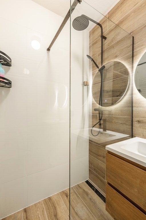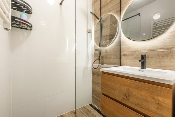 The bedroom is a comfortable, well-proportioned square room and offers direct access to the bathroom. The bathroom was renovated om 2021 and has a modern design, is fully tiled, and features a walk-in shower with glass partition and a vanity unit. The separate toilet is located in the hallway.