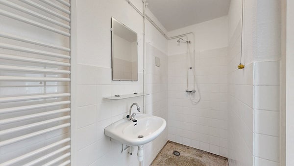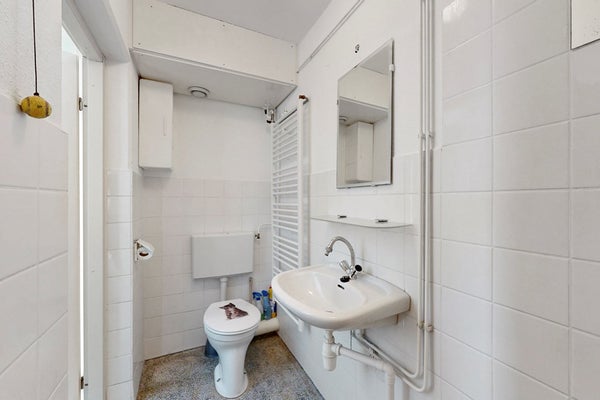 Midden in de woning vind je de praktische badkamer, goed ingedeeld en voorzien van een toilet, wastafel en douche.
