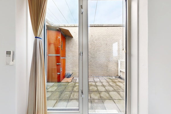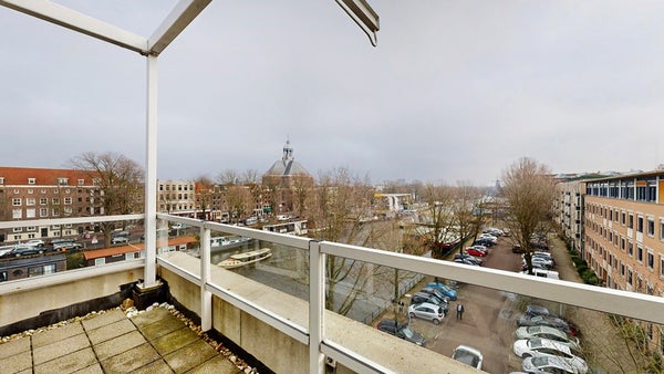 Aan de achterzijde kom je in de ruime slaapkamer met toegang tot het dakterras met uitzicht over de Wittenburgergracht. De airco in de slaapkamer zorgt voor extra comfort tijdens warme dagen.