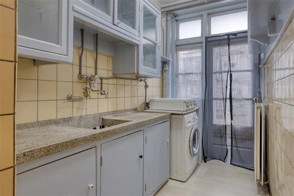 The kitchen is located at the back of the apartment. Everything you need to conjure up delicious meals is here, including a practical connection for the washing machine. Although the kitchen is a bit dated, this offers you the opportunity to renovate it entirely to your taste. The bathroom is also accesible through the hallway, which is compact but functional, with a shower, toilet and sink.