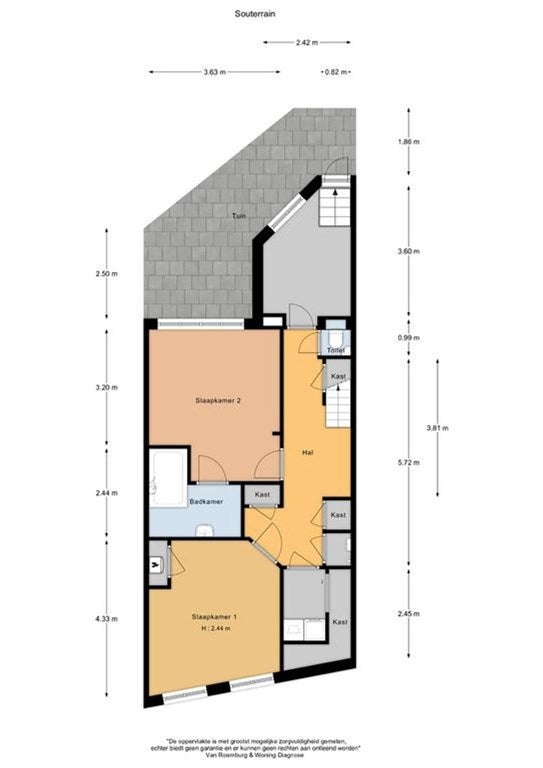 Het souterrain omvat drie kamers, een berging, een badkamer met ligbad en een apart toilet. Eén van de kamers biedt toegang tot de tuin aan de achterzijde.