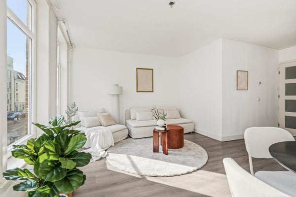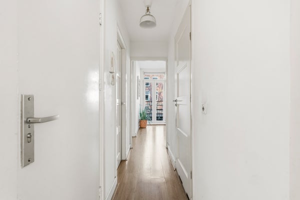 Verzorgd gemeenschappelijke trappenhuis met vervolgens het entree van het appartement op de eerste verdieping. De hal biedt toegang tot alle vertrekken. Aan de voorzijden de grote en lichte woonkamer met een open keuken voorzien van diverse inbouwapparatuur waaronder een koel/vriescombi, een vaatwasser, een magnetron en een combioven. In het midden van het appartement ligt een grote inpandige berging met de opstelling voor de wasmachine/droger en cv-installatie. Tegenover de berging is een separaat toilet gesitueerd. Aan de achterzijde de slaapkamers, waar de kleine kamer thans dienst doet als grote walk-in-closet. De badkamer is vanuit de slaapkamer toegankelijk en is voorzien van een wastafelmeubel en een inloopdouche. Aan de achterzijde ligt het balkon gelegen op het noordwesten. Door het gehele appartement ligt een fraaie whitewash laminaat vloer. De gevel is gereinigd en opnieuw gevoegd en de ramen zijn zowel aan de voor als achterzijde voorzien van dubbele beglazing.