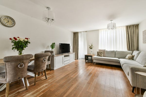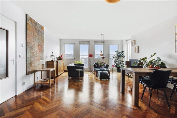 The spacious living area of approximately 50 m² (living room approximately 38 m² and open kitchen approximately 12 m²) forms the heart of the home. Large windows all around offer spectacular, unobstructed views of the IJ, where cruise ships and boats pass by – a living painting that never gets boring. Throughout the home, there is beautiful Merbau parquet flooring in a herringbone pattern, which exudes warmth and class.